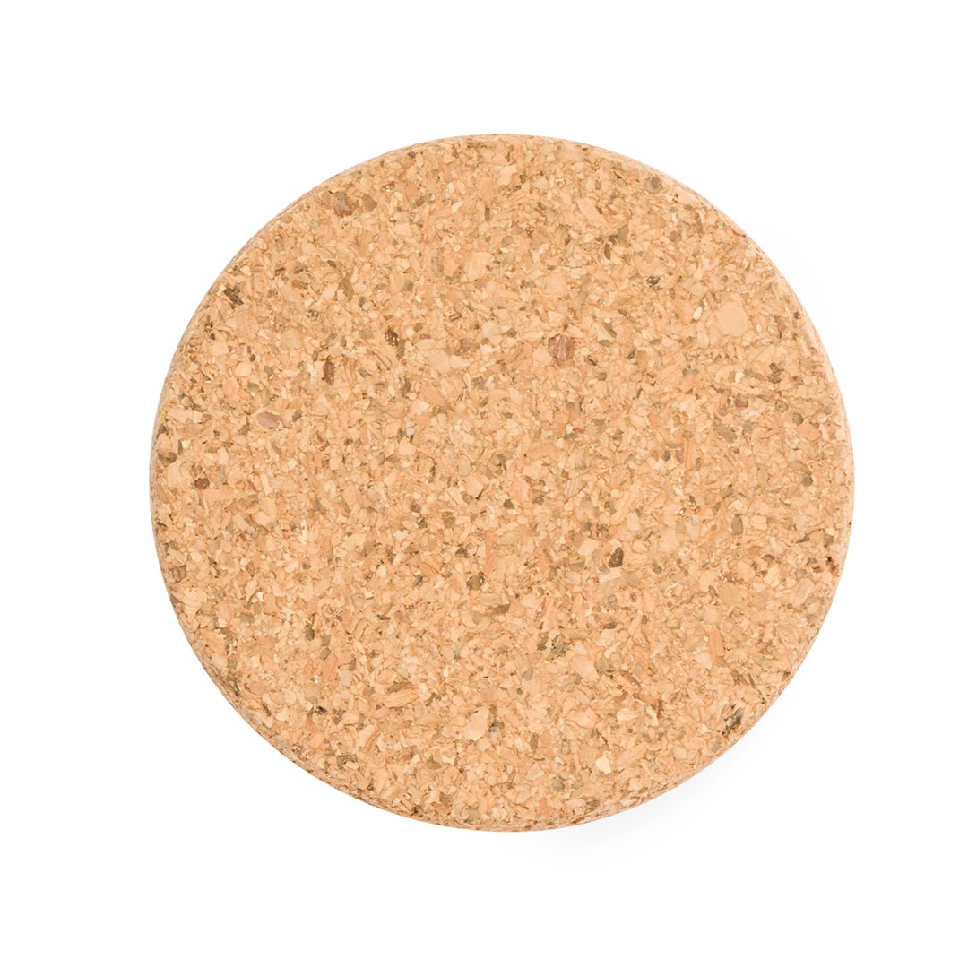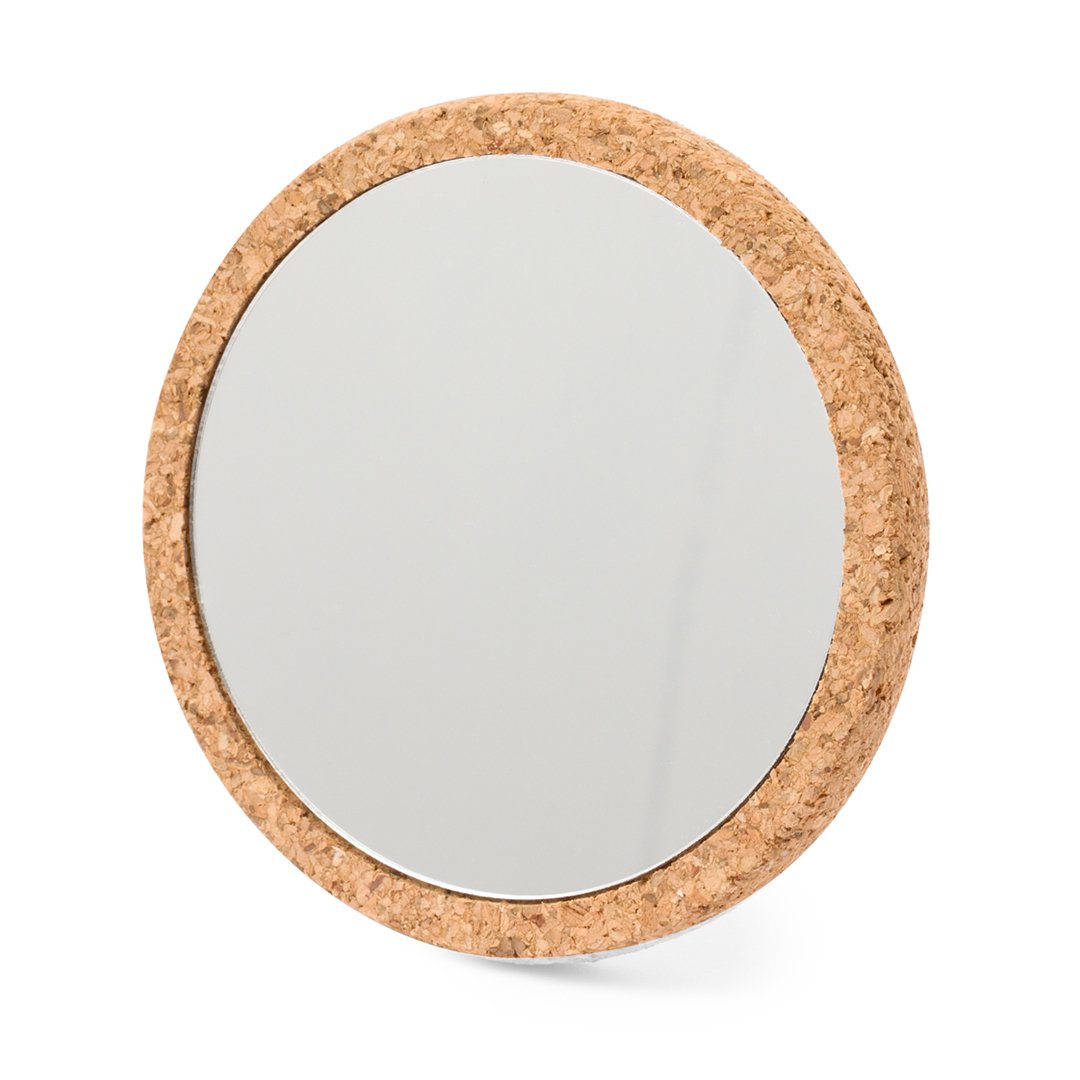 Espejo 1X fabricado en corcho. Práctico espejo portátil recubierto de suave corcho y presentado en una caja individual diseño kraft.