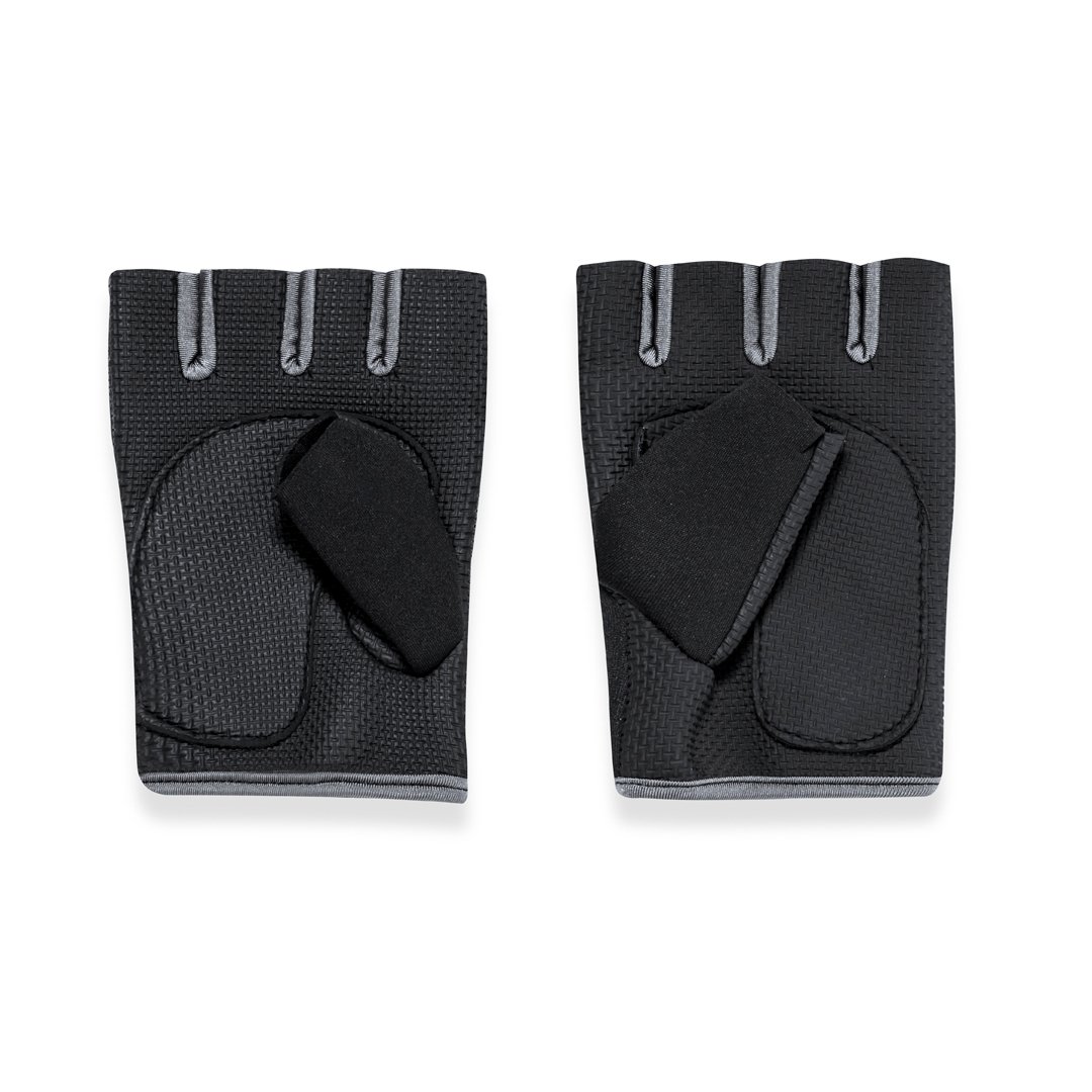 Guantes deportivos fabricados en suave poliéster y licra de neopreno, cuya combinación de tejidos crea una segunda piel que se adapta a la mano. cuentan con un cierre en la muñeca mediante velcro. Estos guantes son cómodos para cualquier disciplina gracias a su alta transpirabilidad, que se logra mediante el diseño de dedos al aire y los disipadores de calor en la parte superior, que además presentan un acabado rugoso para un óptimo agarre. Disponibles en color negro y con costuras en gris, en tallas S-M y L-XL. Presentados en una bolsa reciclada.