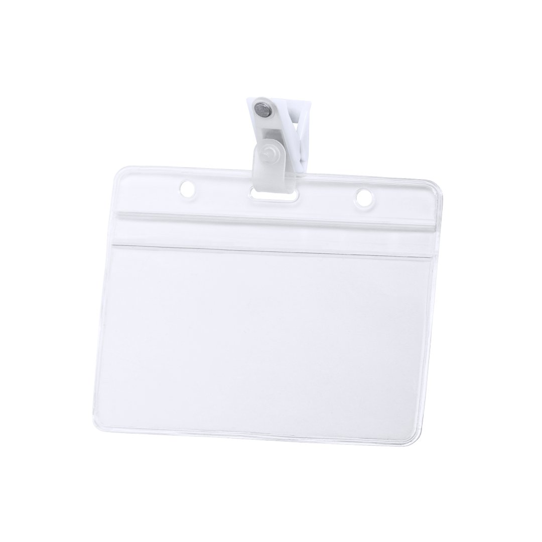 Identificador troquelado en PVC con clip de fijación en color blanco. Disponible en diseño horizontal y vertical.