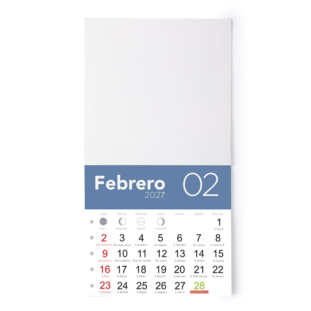 Práctico imán calendario en cartón. Diseño mes en curso y santoral. Con amplia superficie de marcaje.