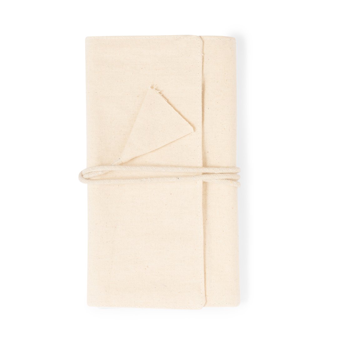Joyero plegable fabricado en algodón, para guardar preciados artículos personales. Confeccionado en 3 partes de color natural: parte superior con cintas, parte central con bolsillo y parte inferior con bolsillo de cremallera, pudiendo plegarlo y sujetarlo firmemente con su cordón a juego.