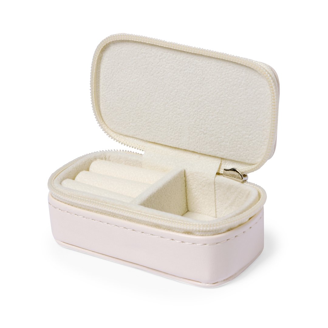 Estuche joyero fabricado en polipiel. Diseño de color natural con cierre de cremallera y dos compartimentos en su interior. Un compartimento en forma de cajita y otro compartimento con almohadillas para sujetar anillos y pendientes, forrado de suave tela. Presentado en una bolsa de papel individual.