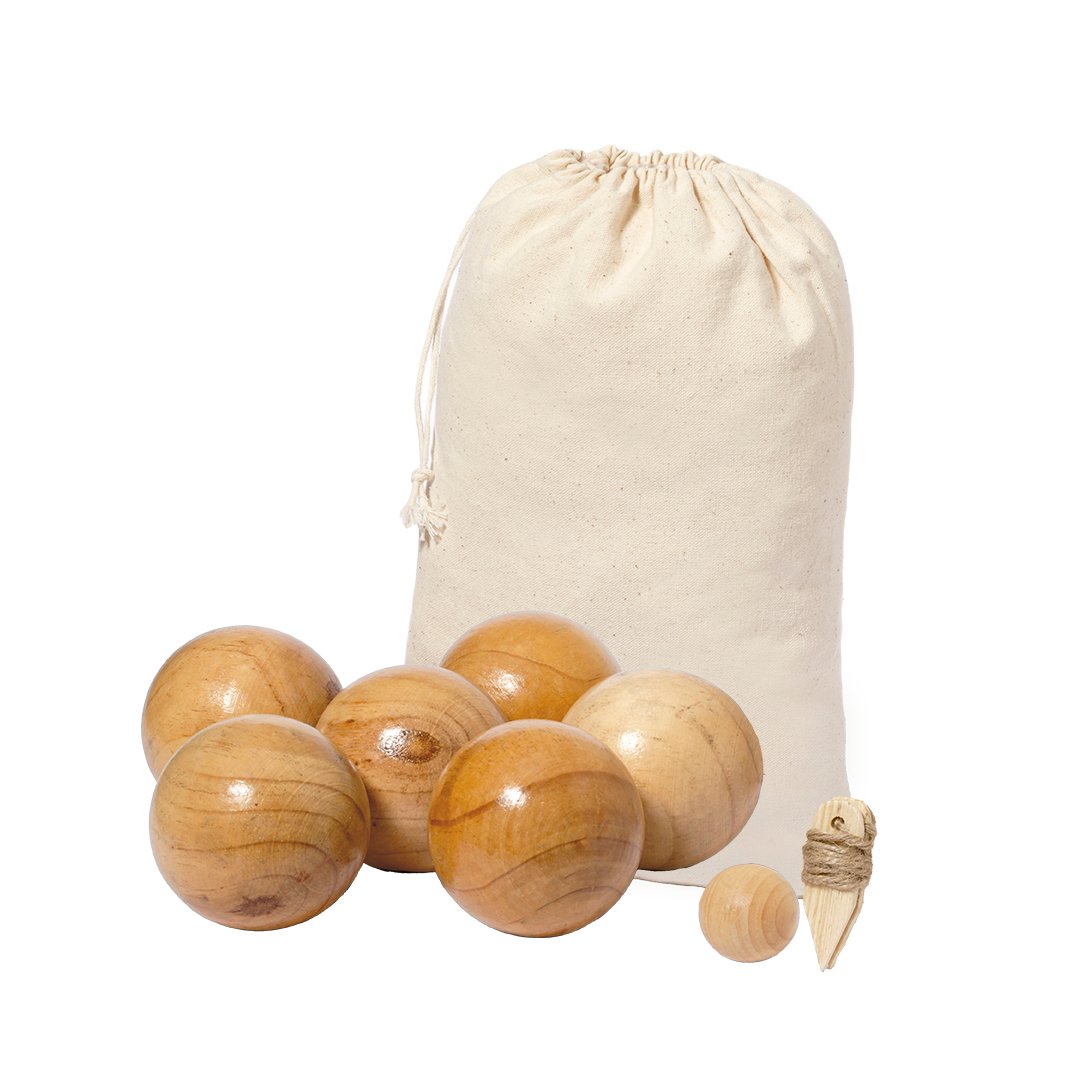 Juego de petanca fabricado en madera. De inspiración artesanal, incluye 6 bolas, un boliche y cuerda de medición. Presentado en una práctica funda de transporte fabricada en algodón de acabado natural y con cierre de cordón.