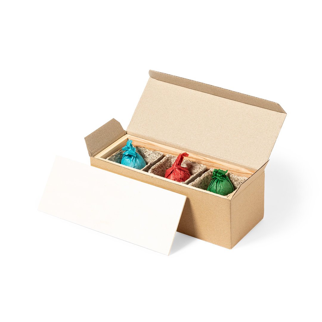 Kit huerto con semillas de cilantro, perejil y albahaca. Bolsitas en estuche de madera con instrucciones de plantado, distintivo Made in Europe y con 3 compartimentos independientes. Presentado en en atractiva caja individual de diseño eco y acabado kraft.