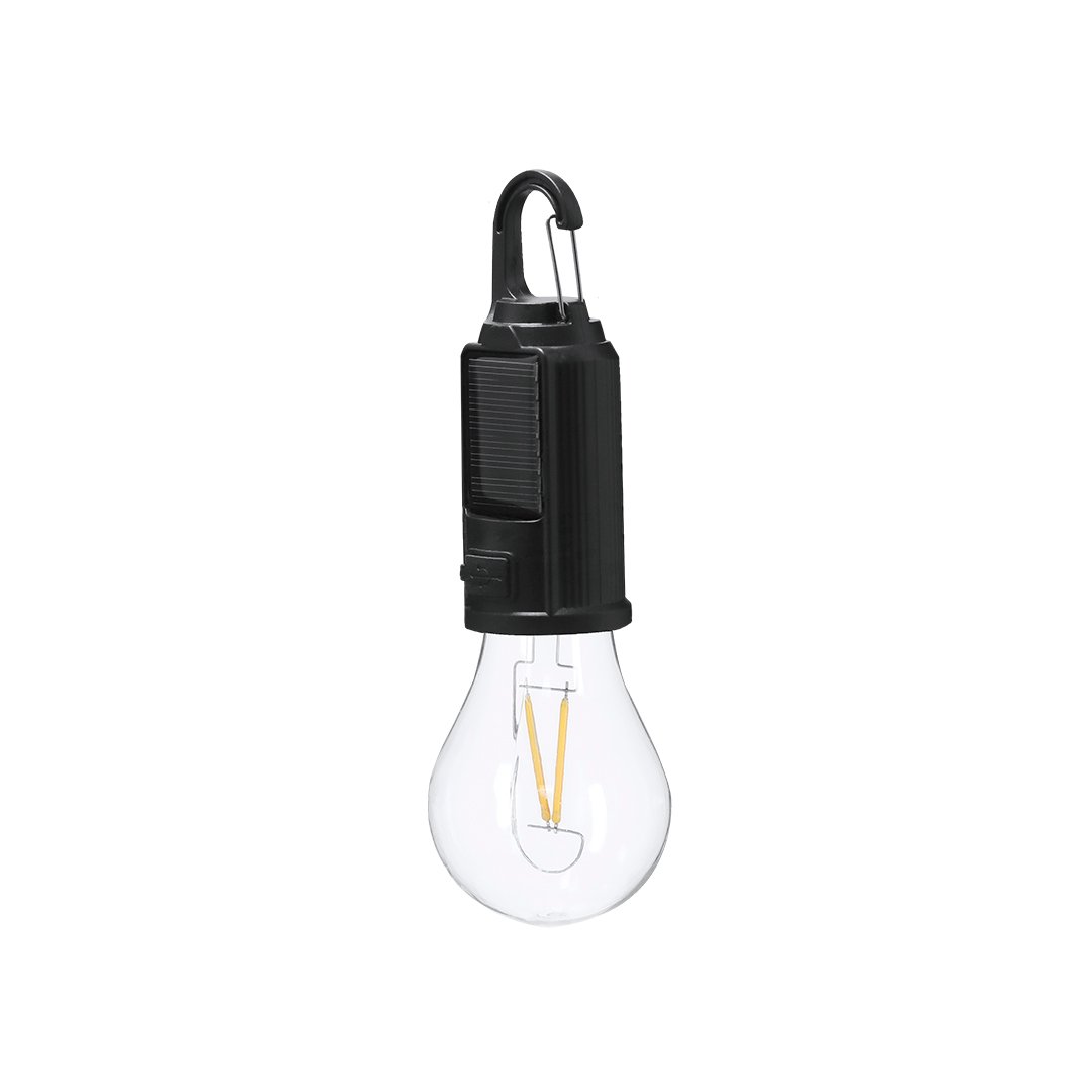 Lampara con original diseño de bombilla con cuerpo en ABS. Batería de 300 mAh y carga solar. Dispone de sensor nocturno que se activa automáticamente al no recibir luz solar. Dispone de carga a través de cable Tipo C, además de incluir mosquetón para fácil transporte.