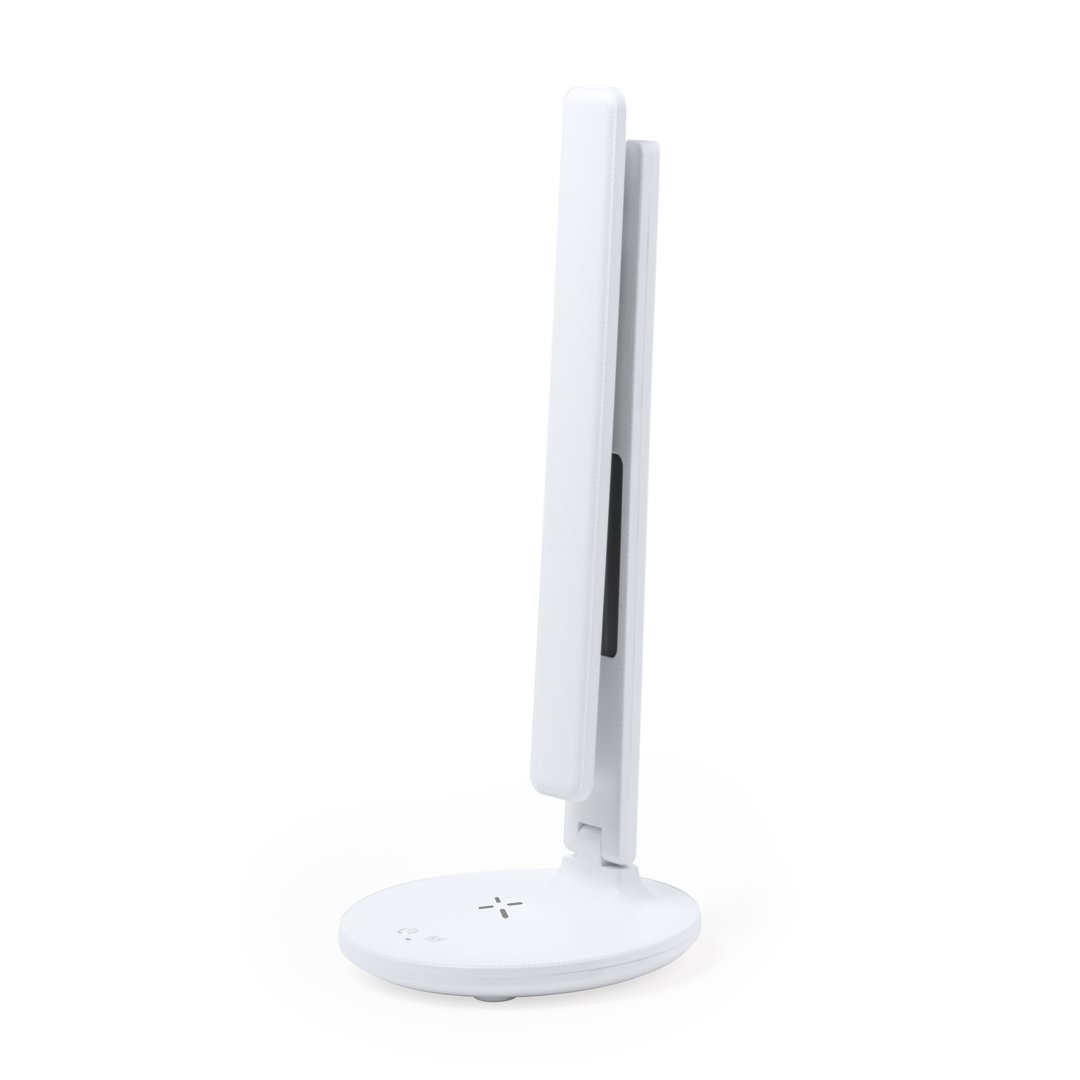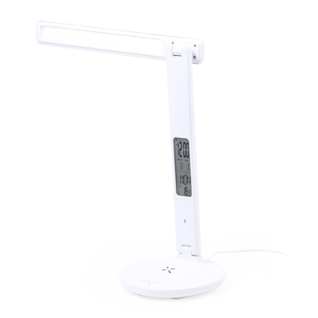 Lámpara multifunción plegable todo en uno, fabricada en resistente ABS blanco con acabado imitación piel. Provisto de 60 LEDs y 3 posiciones de iluminación (cálida, fría y media), con intensidad de luz regulable mediante el botón táctil de la base. Extensible y fácil de orientar, con pantalla de LCD integrada y retroiluminada, que marca hora, fecha, día y temperatura. Con botones de ajuste en la parte trasera y pila de botón incluida para guardar los datos. Incluye un cargador inalámbrico 10W integrado en la base, con entrada Tipo C y compatible con dispositivos móviles de carga inalámbrica. Con cable cargador Tipo C, y manual de instrucciones en español e inglés. Presentada en una atractiva caja de diseño kraft.