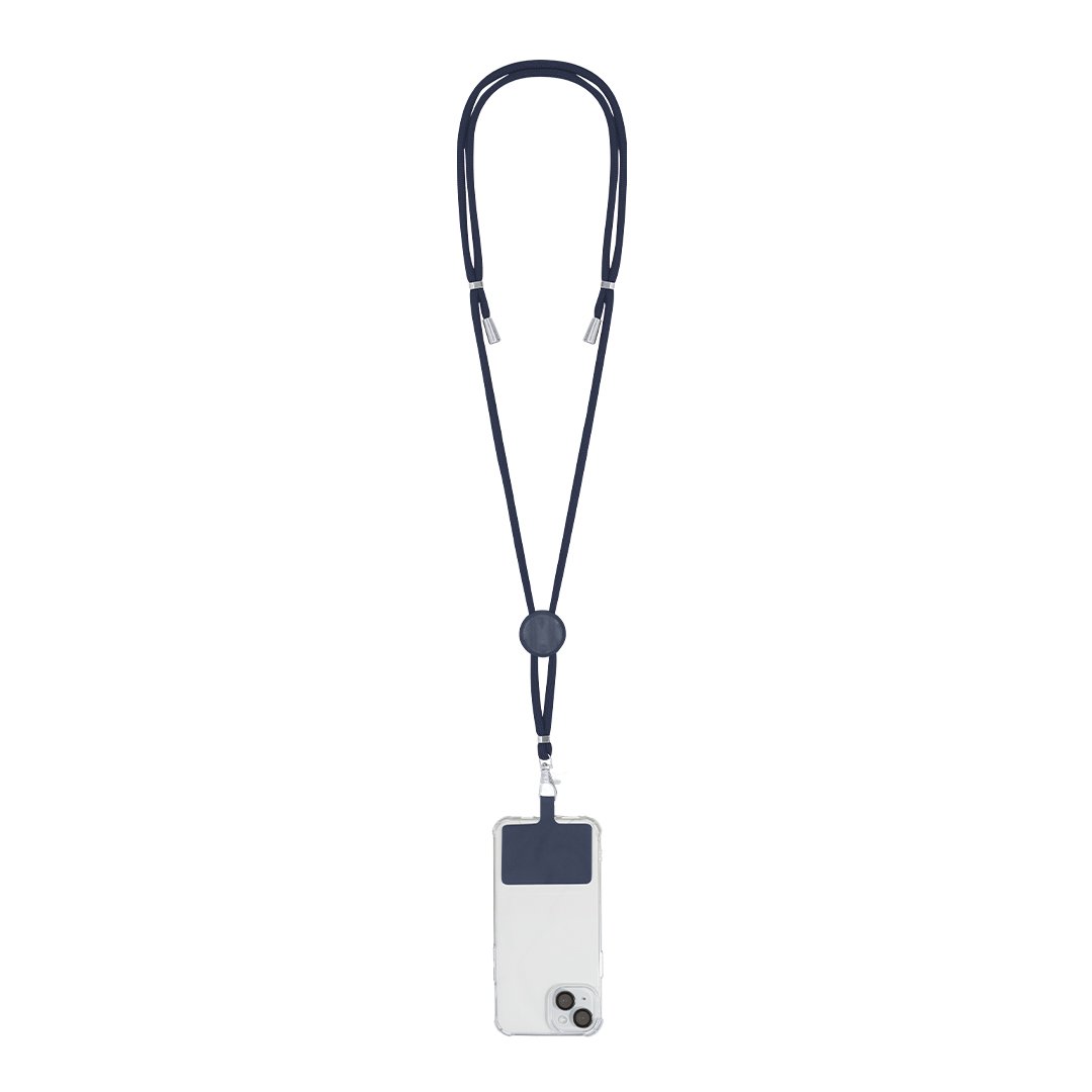 Lanyard con accesorio para smartphone. Fabricado en resistente poliéster. Accesorio de transporte para situar entre la funda y el smartphone y mosquetón giratorio metálico. Ajustadores en cuello, con detalles cromados en los extremos de los cordones de ajuste.
