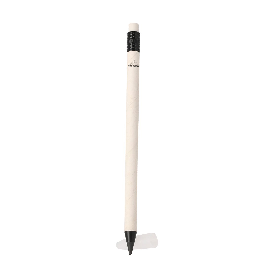 Lápiz eterno fabricado con cartones de leche reciclados. Reutilizable y con escritura infinita. Incluye goma de borrar en la parte superior del lápiz y capucha de protección. De color blanco, con detalles en negro. Con distintivo de cartón de leche reciclado en el cuerpo.Los cartones de leche se componen en su mayor parte de cartón y aluminio. Durante su proceso de reciclado, se separan los distintos materiales del envase para su reutilización y nuevo uso, contribuyendo así a recorrer el camino infinito de la economía circular. Este material se caracteriza por su alto grado de reciclabilidad, así como por su ligereza y resistencia.
