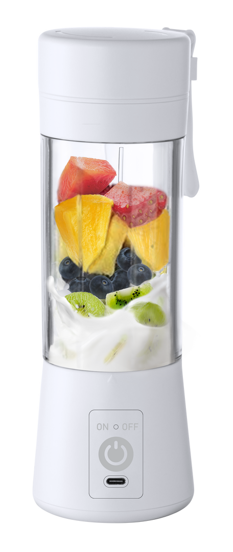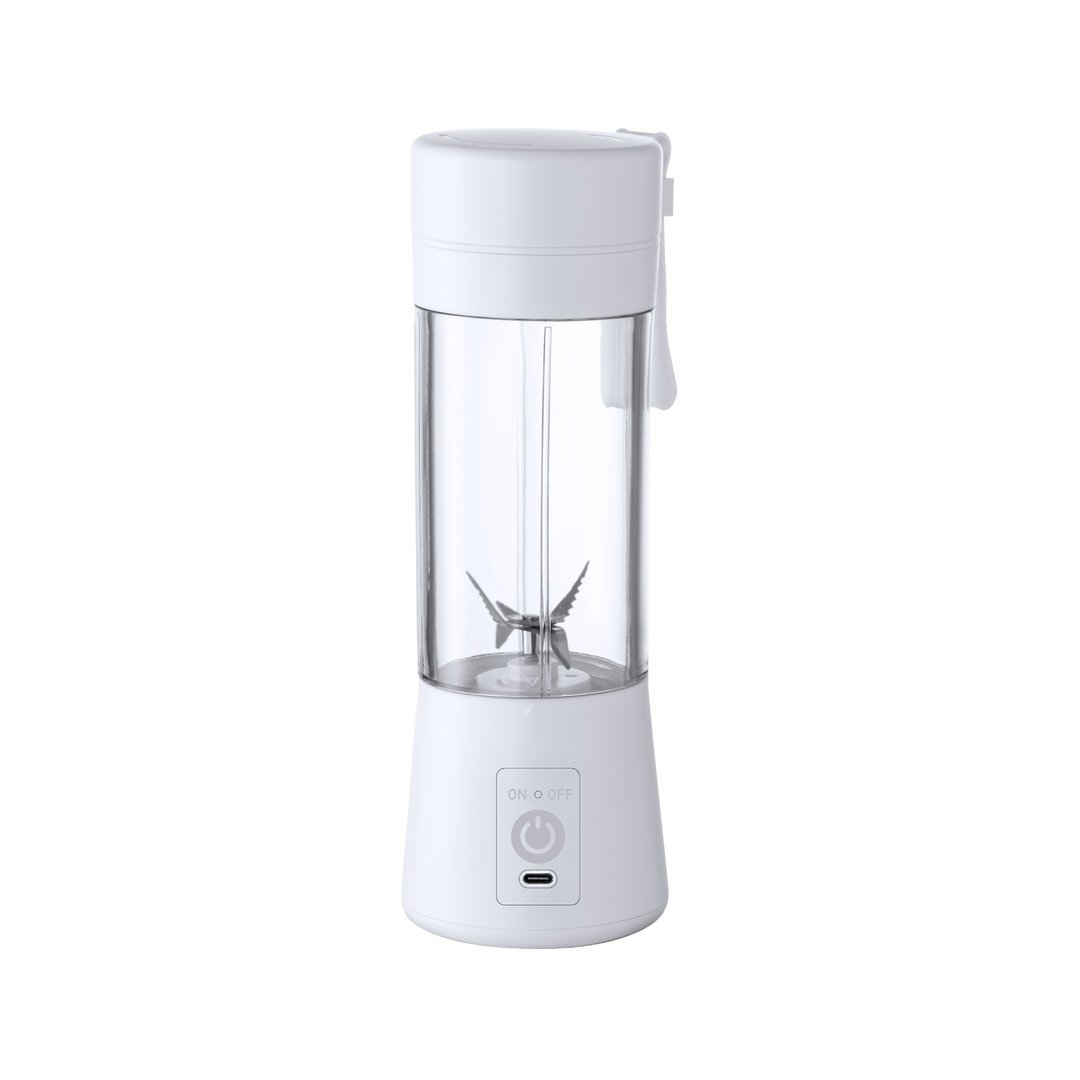 Licuadora fabricada en resistente material ABS de acabado blanco. De 380ml de capacidad y 150W de potencia, con limpiador y pinza incluidos. Batería de 2.000 mAh de capacidad, con conexión Tipo C (cable incluido). Presentada en caja individual de diseño kraft, con manual de instrucciones en español e inglés.