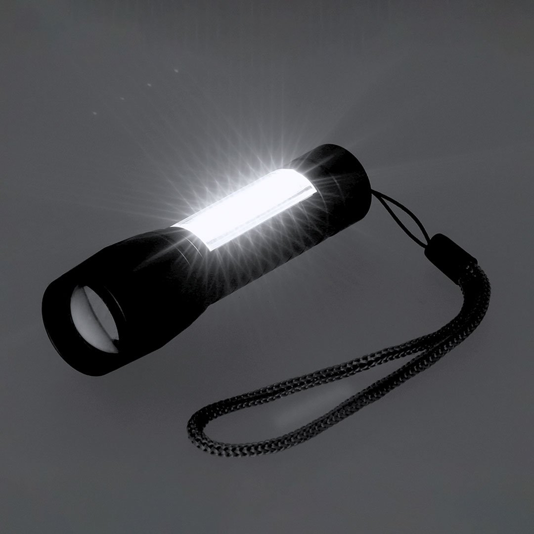 Potente linterna con batería recargable, fabricada en aluminio de acabado en mate. Luz frontal con 8 LEDs y zoom ajustable. Además, cuenta con 10 luces COB en el mango y tres modos de iluminación (fija e intermitente y lateral), incluye cinta de trasporte. Se alimenta mediante una batería recargable de 400 mAh, incluido cable tipo C.