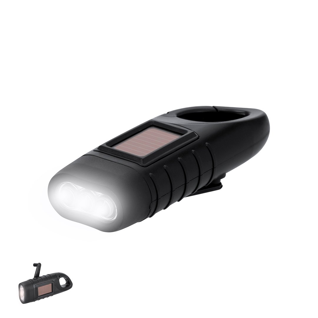 Linterna en ABS Reciclado con carga solar y carga manual con sistema dinamo ajustable de 360°. Dispone de 3 LEDs de luz blanca alimentada tanto por panel solar recargable como por 3 pilas de tipo botón de 40mAh. Incluye una funcional asa de agarre en forma de mosquetón pudiendo ser fácil de transportar. Una solución práctica para mantenerse siempre preparado.