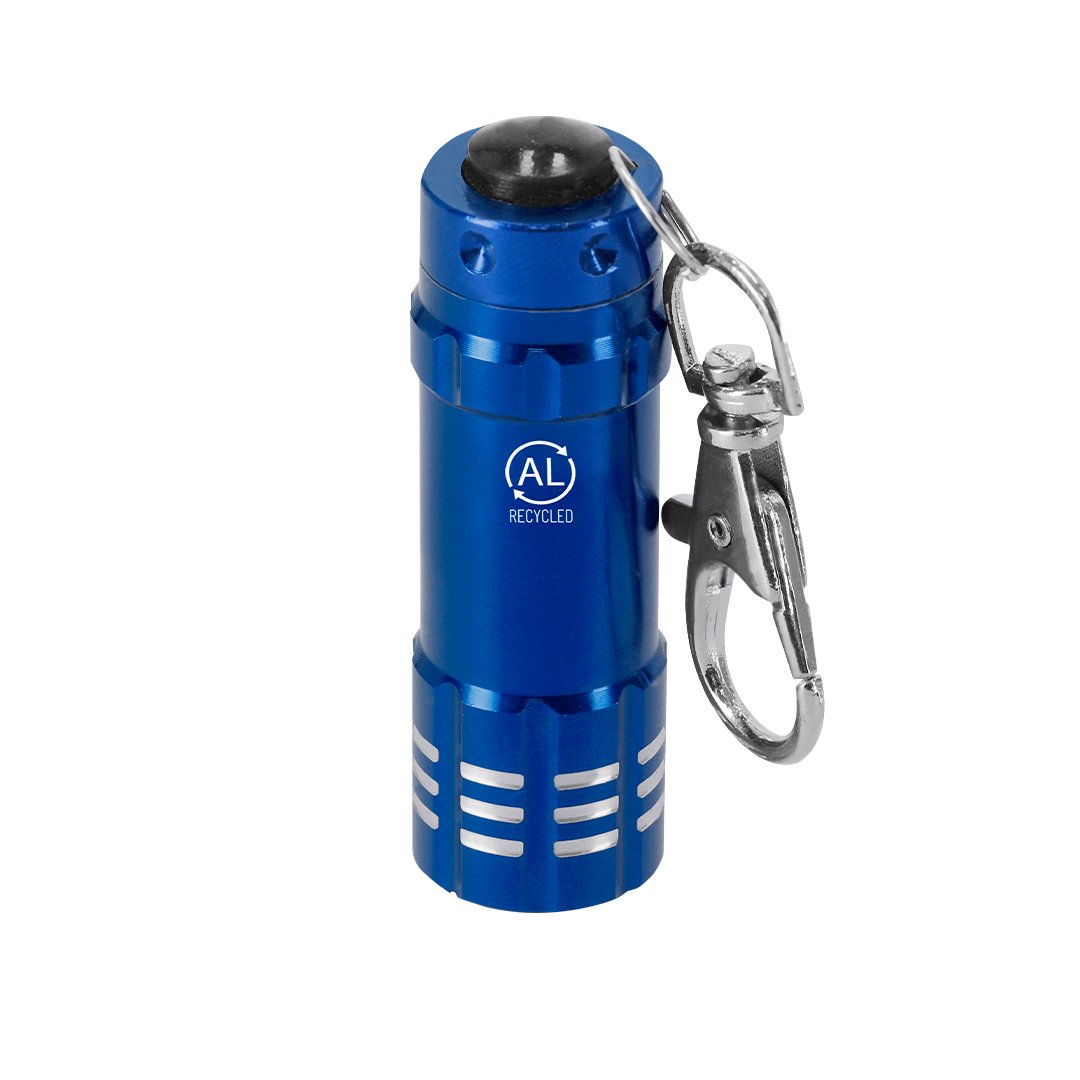 Resistente llavero linterna fabricado en Aluminio Reciclado con acabado brillante. Este práctico accesorio cuenta con 3 luces LEDs alimentadas por pilas de botón incluidas. Botón de encendido y apagado en la parte trasera en silicona. Su diseño incluye un mosquetón, ofreciendo un fácil transporte. Incluye logotipo Aluminio Reciclado.