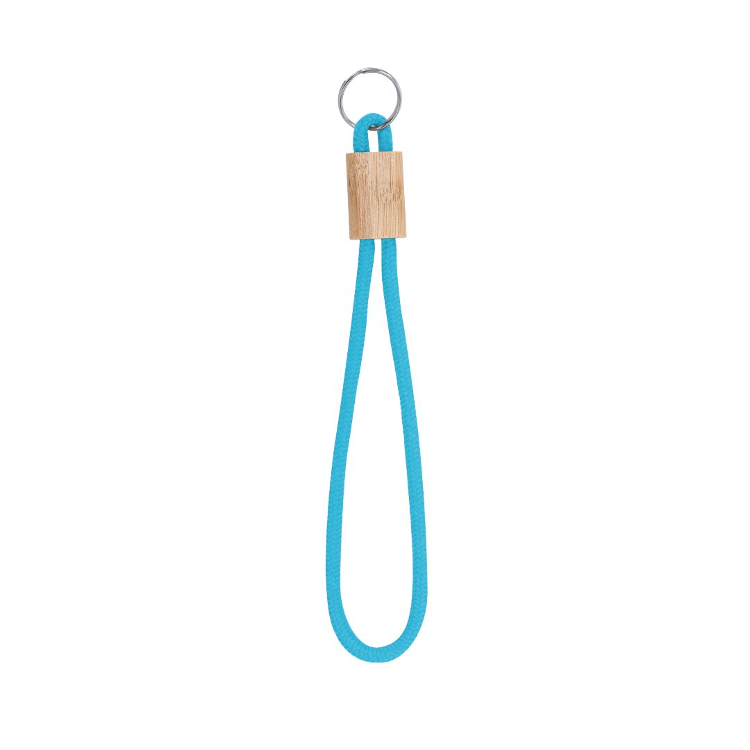 Llavero cordón de poliéster en color, ajustable en bambú y anilla metálica.