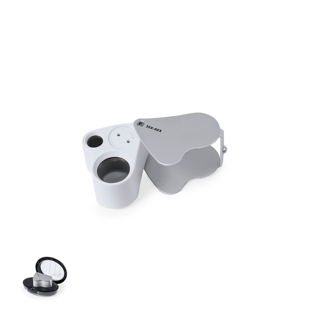 Lupa plegable doble con aumento 30x y 60x, fabricada en resistente metal. Con luces LED integradas y gran potencia de aumento para obtener una visión muy cercana de los detalles más pequeños y ampliación sin distorsión. Ideal para inspeccionar objetos de tamaño reducido, textos, etc. Además, tiene un accesorio para colgar, y viene dentro de un estuche con interior acolchado para una mayor protección. Alimentación a pilas (de botón incluidas), con llave especial para reemplazarlas cuando se agoten. Presentada en caja de cartón negra.