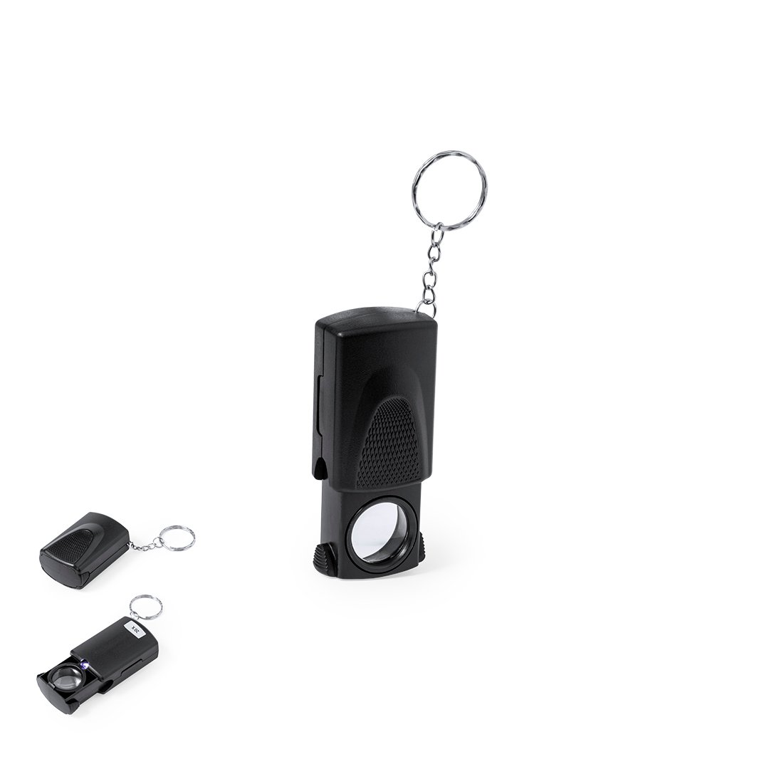 Práctica lupa llavero con aumento 20x y luz LED integrada. Fabricada en resistente ABS de color negro y fácil de transportar por su reducido tamaño. Alimentada por 1 pila de botón (incluida) y presentada en caja individual de cartón negra.