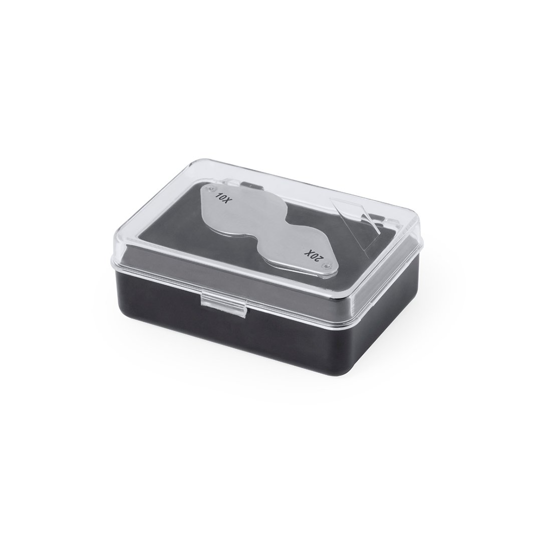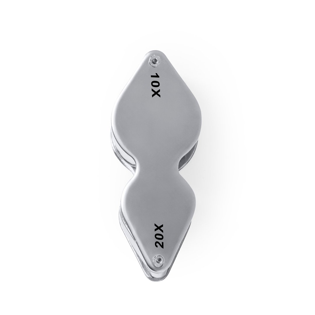 Lupa plegable doble con aumento 10x y 20x, fabricada en resistente metal. Gran potencia de aumento para obtener una visión muy cercana de los detalles más pequeños, con ampliación sin distorsión. Ideal para inspeccionar objetos de tamaño reducido, textos, etc. Además, viene dentro de un estuche con interior acolchado para una mayor protección. Presentada en caja de cartón negra.