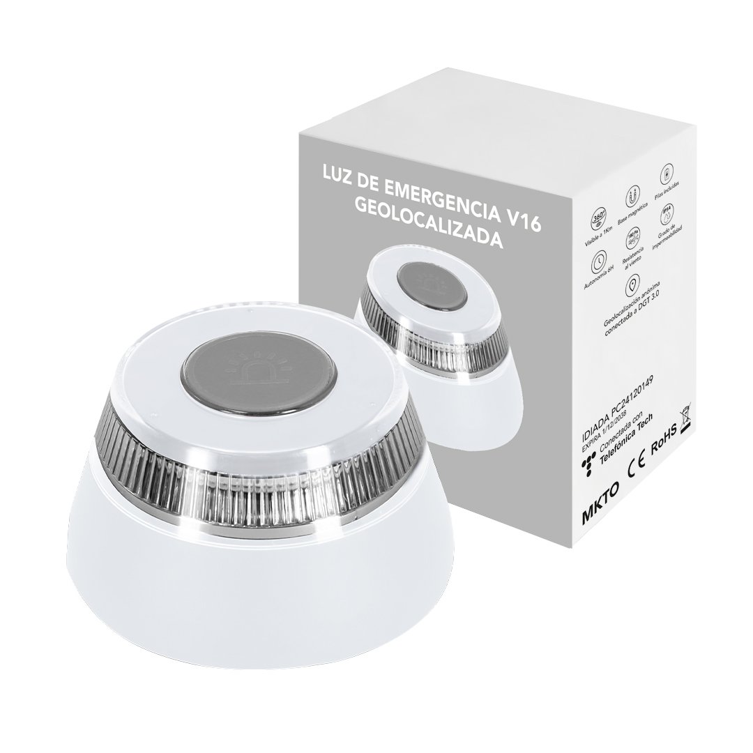 Luz de emergencia V16 Geolocalizada para vehículos. Fabricada conforme a la normativa de seguridad vigente y homologada por laboratorio acreditado IDIADA, según requisitos de la DGT , con número de homologación marcado en la parte inferior del artículo. De activación manual y con base de fijación magnética. Resistencia al viento de hasta 180Pa, visibilidad 360 -hasta 1 km de distancia- y resistencia al agua conforme a estándares IP54. De tamaño compacto para guardar en cualquier compartimento del vehículo y tenerla a mano en caso de emergencia. Presentada en caja individual de diseño. Manual incluido (español e inglés). Alimentación a pilas (3xAA pilas alcalinas incluidas).Certificado de Cumplimiento PC24120149 emitido por IDIADA, conforme a los requisitos de la DGT.