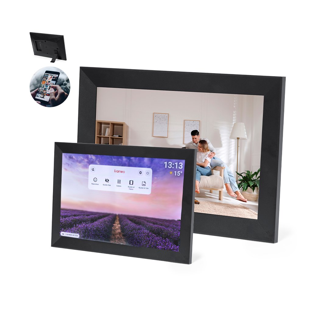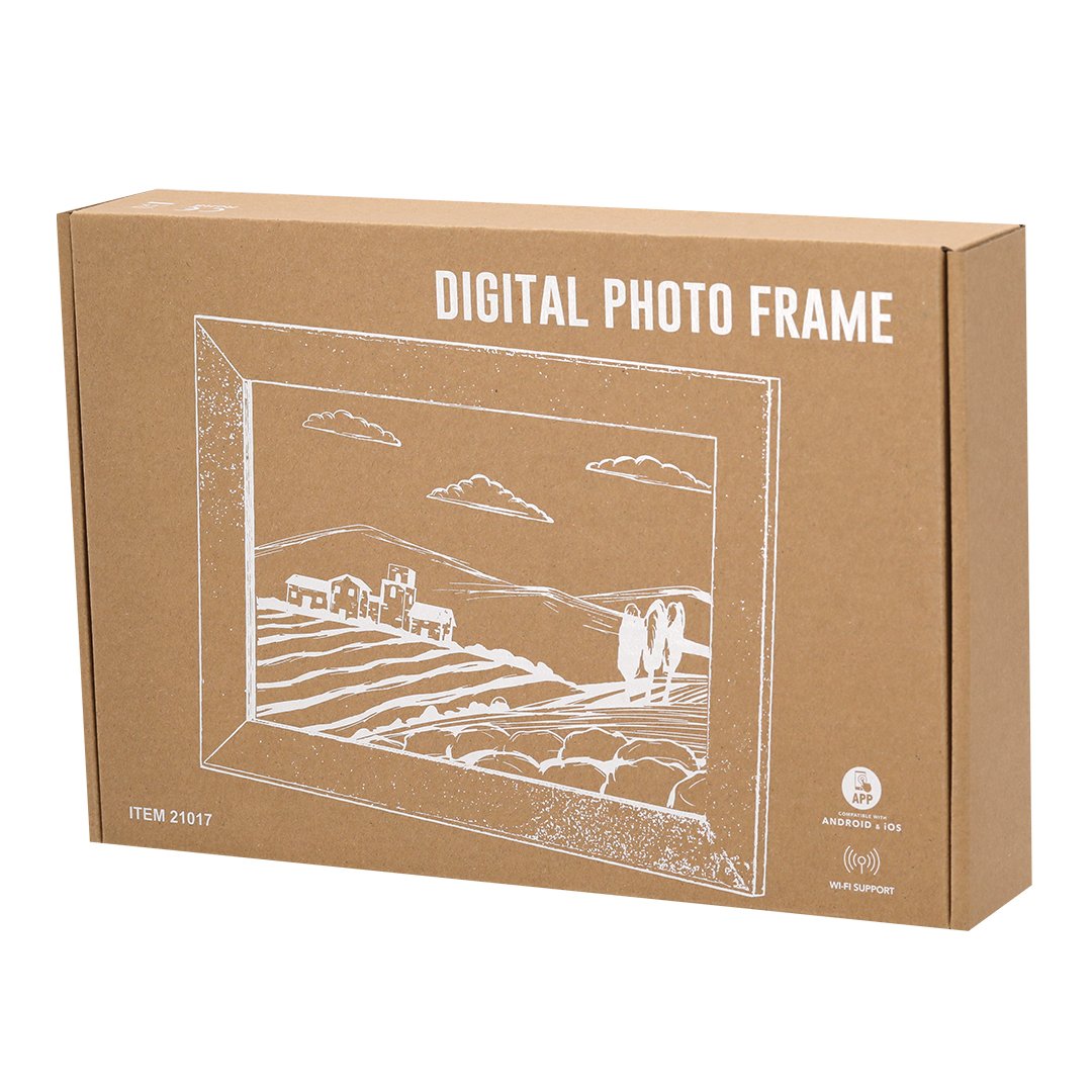 Marco de fotos digital de 10,1 pulgadas. Con pantalla táctil IPS de alta resolución de 1280×800 píxeles, conectividad WiFi, y equipado con funciones inteligentes como visualización del tiempo, alarma y reloj. Ademas incorpora un menú para explorar un mundo de posibilidades al ver videos, fotos y escuchar música, con opción de visualización en formato horizontal y vertical. Con soporte en la parte trasera y ranuras para colgar en la pared. Alimentación CA 220V-240V, con cargador incluido. Presentado en caja de diseño kraft y disponible manual de instrucciones en español e inglés.