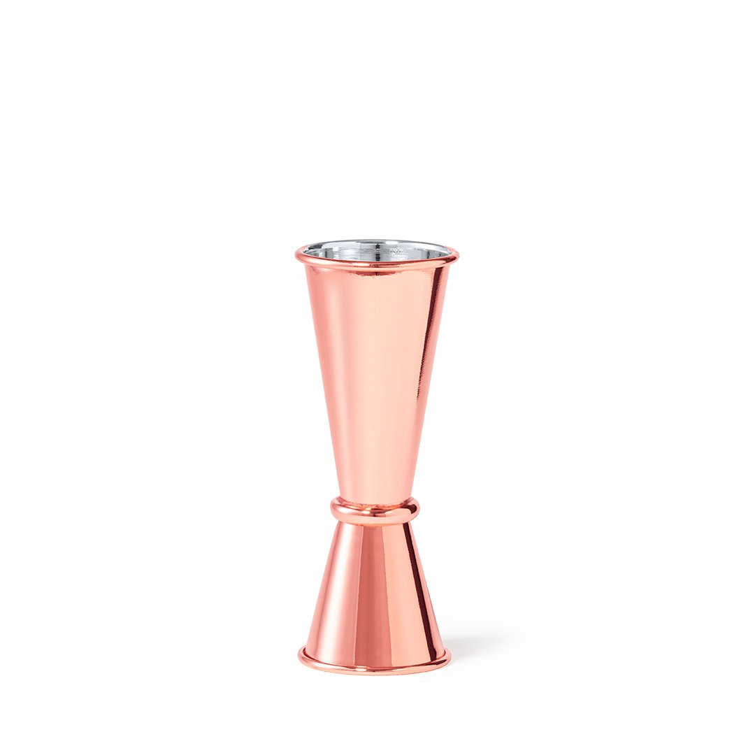 Medidor de bebidas fabricado en acero inox con recubrimiento exterior de cobre galvanizado. 2 dosificadores: sencillo 25ml y doble 50ml. Presentado en atractiva caja individual de diseño.