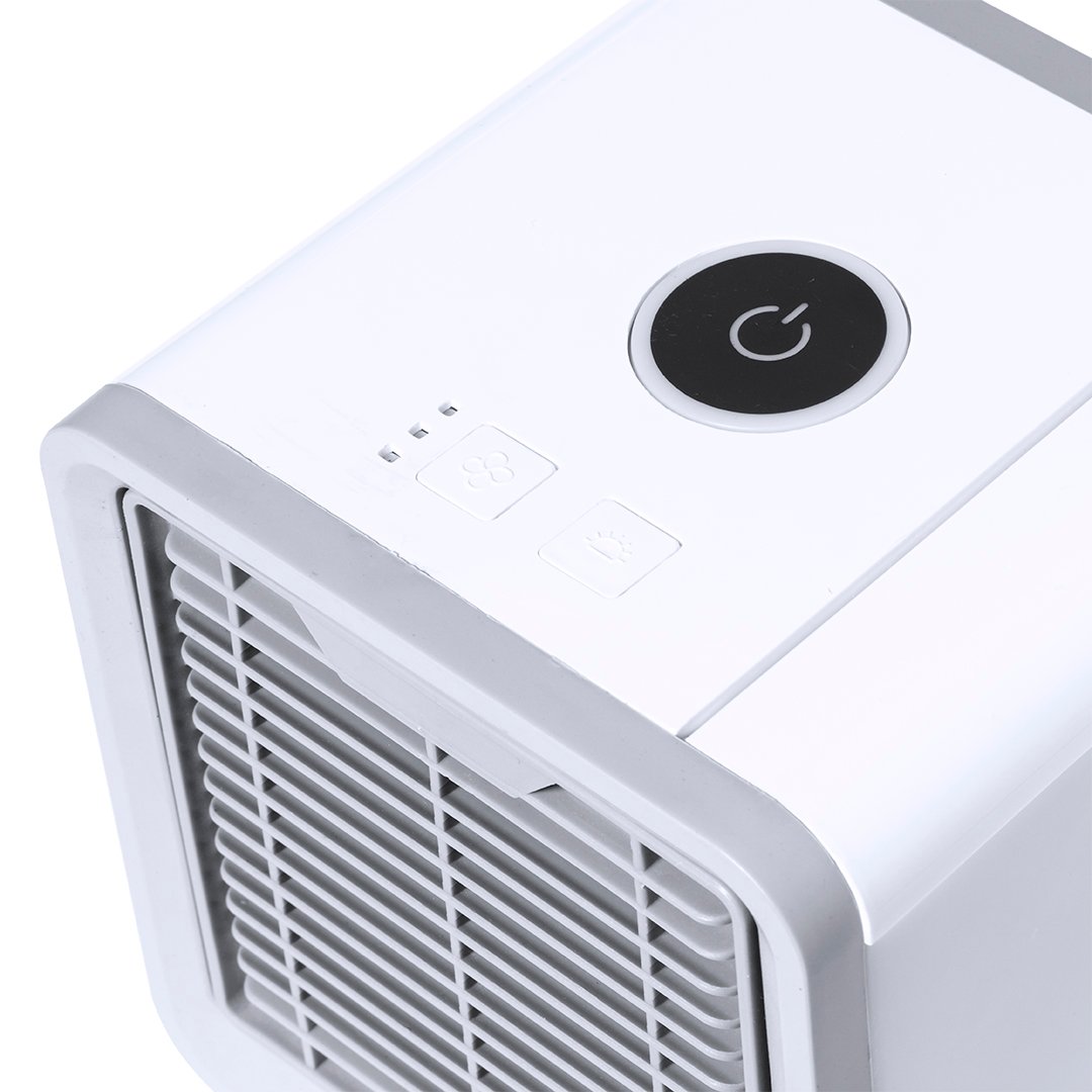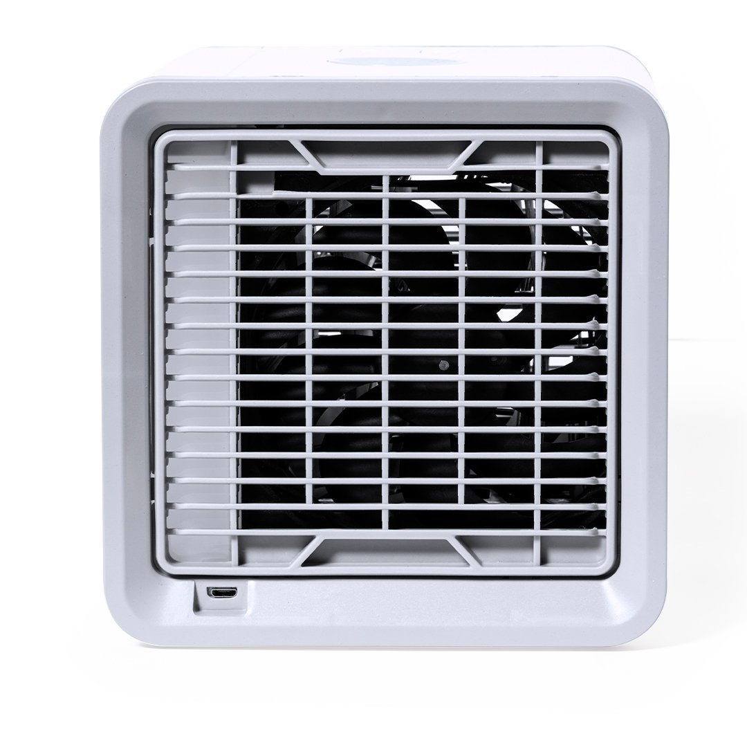 Mini dispositivo portátil de aire acondicionado para enfriar y purificar el aire. Al ser pequeño y ligero, es fácilmente transportable. Ventilador con tres velocidades a elegir (alta, media, baja). Incluye un depósito de agua de gran capacidad -700 ml-, con posibilidad de añadir cubitos de hielo para conseguir un aire más fresco alrededor. Se conecta a la corriente eléctrica a través de un cable de alimentación USB -incluido- y viene presentado individualmente en caja de diseño kraft. Disponible manual de instrucciones en español e inglés.