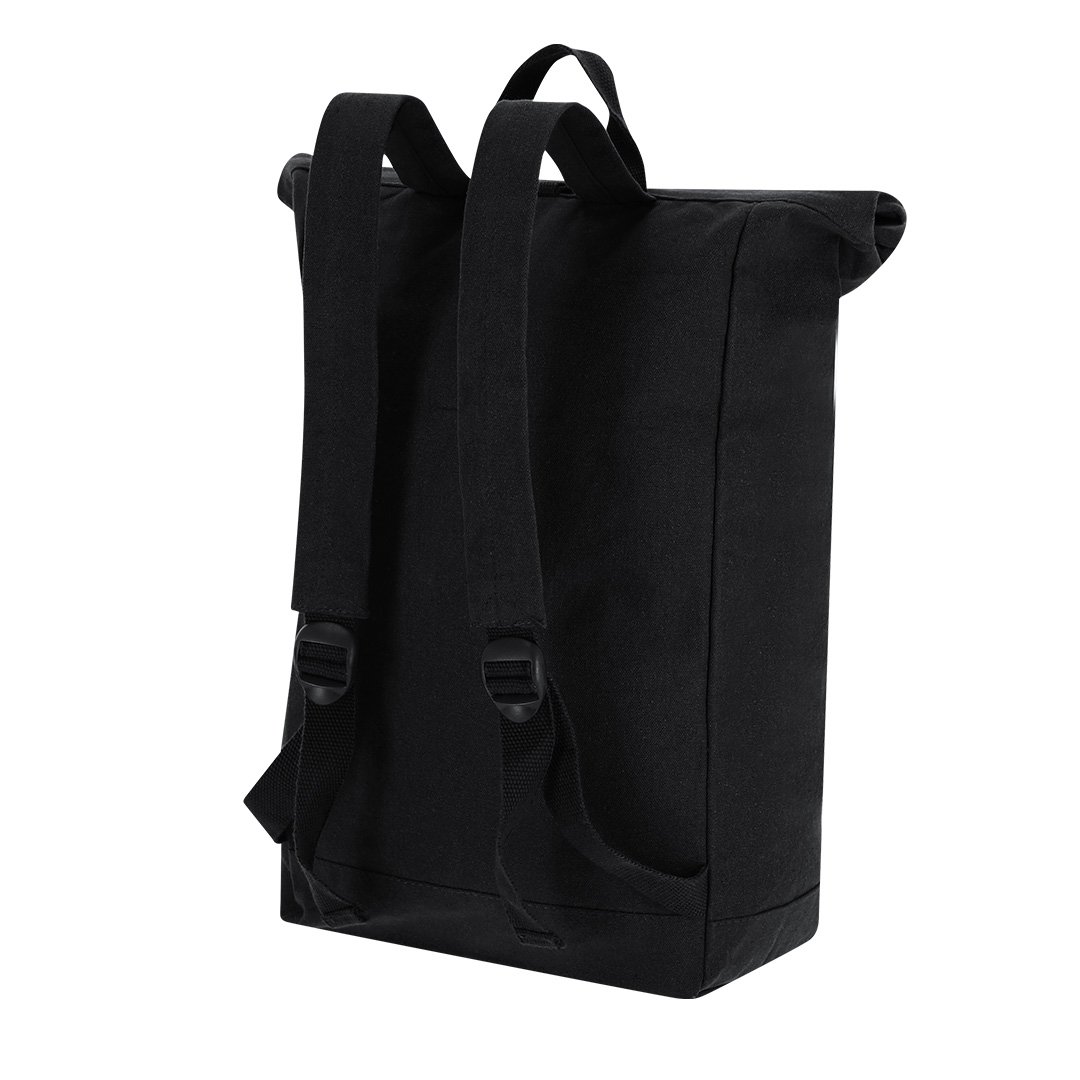 Mochila fabricada en material 100% canvas reciclado. Compartimento principal de gran capacidad con cierre de hebilla de seguridad y velcro, incluyendo un bolsillo frontal con cierre de cremallera invisible. Bolsillo lateral abierto de rápido acceso y asa superior. Con cintas para los hombros ajustables y etiqueta exterior con logotipo Algodón Reciclado.