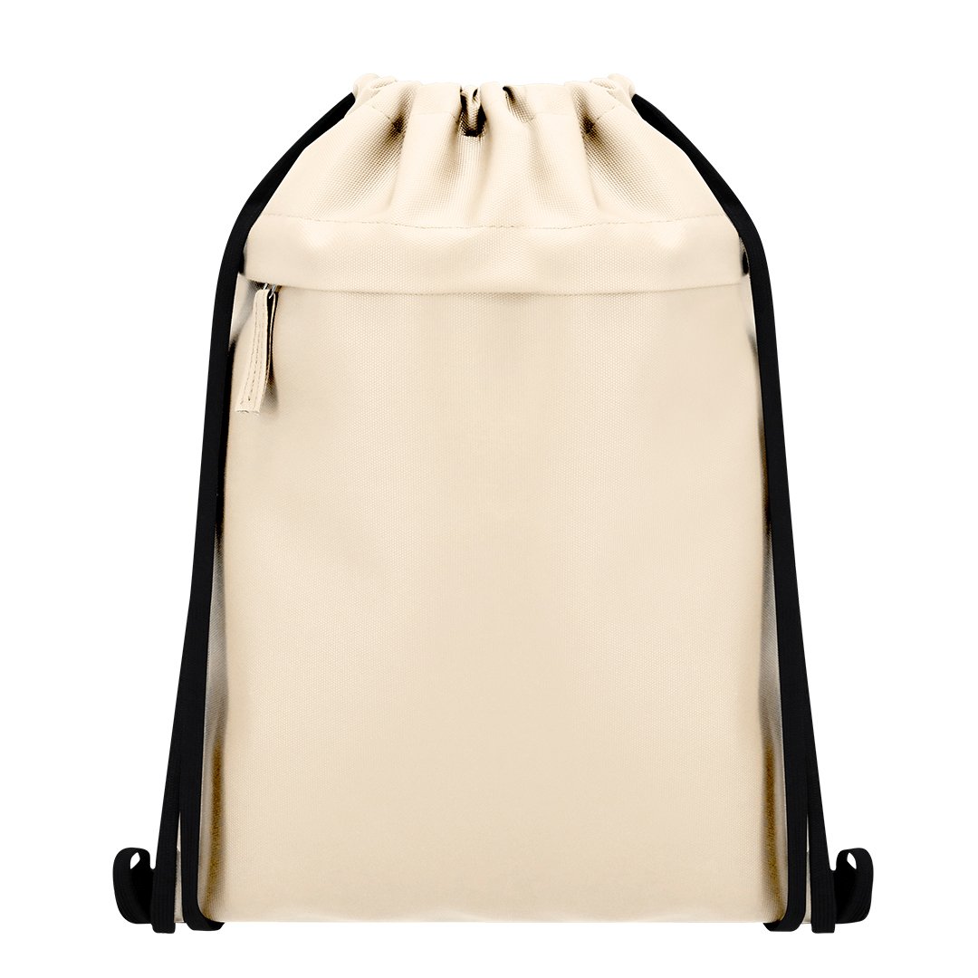 Mochila de cuerdas fabricada en suave PU combinado con resistente poliéster 600D. Incluye funcional bolsillo frontal con cierre de cremallera y tirador a juego en PU.