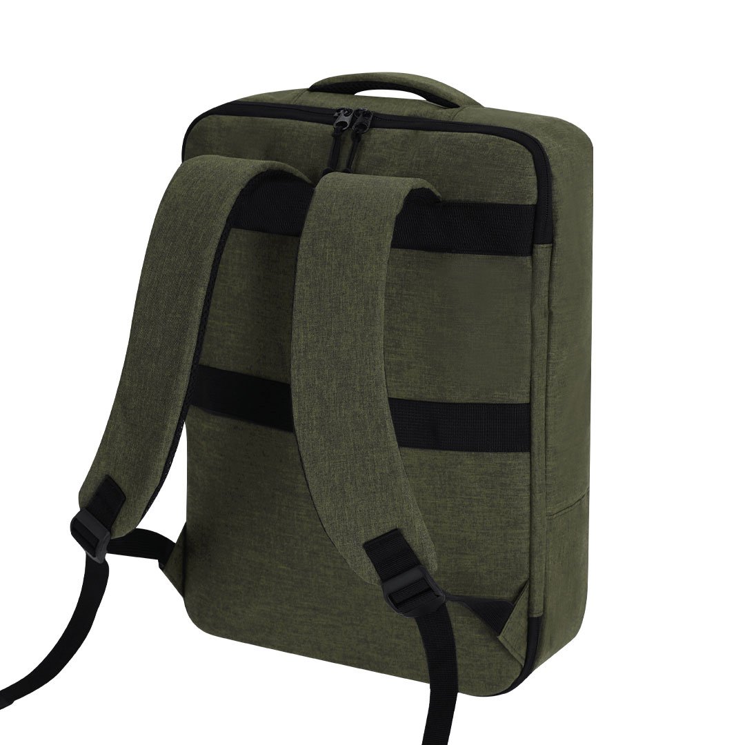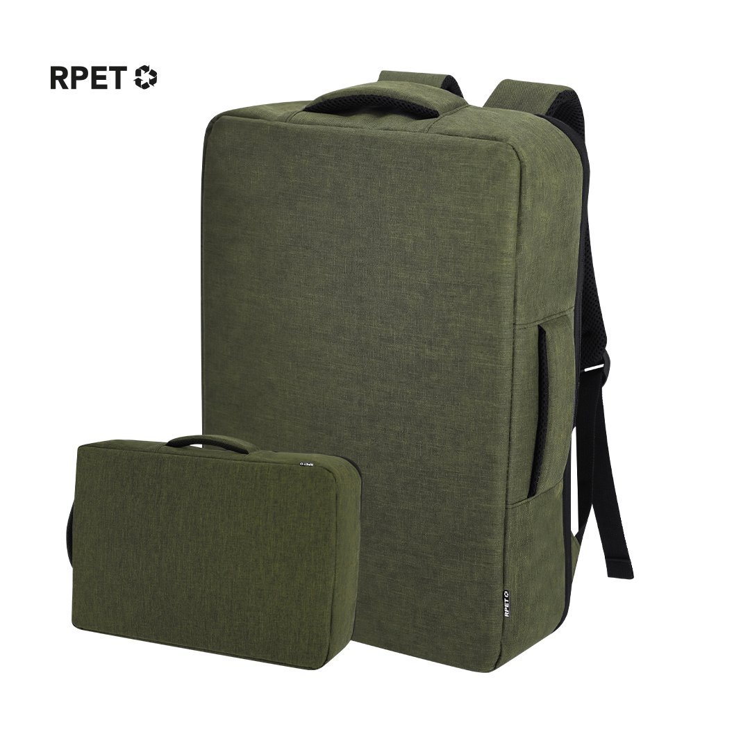 Mochila portadocumentos confeccionada en resistente RPET 300D. Presenta un diseño urbano que incorpora un bolsillo principal con cierre de cremallera oculta para mayor protección, de doble tirador. Con interior acolchado para portátil de hasta 15 pulgadas, bolsillos adicionales en el interior para pequeños objetos. Sus cintas de hombros y la espalda están acolchadas y son ajustables para mayor comodidad. Ofrece tres modalidades de transporte: como mochila, gracias a las tiras de hombros colchadas; como portadocumentos, gracias a su asa de transporte; y cinta para trolley. El material RPET se elabora a partir de plástico reciclado, para así fomentar la reutilización de residuos plásticos y ayudar a la sostenibilidad del planeta.