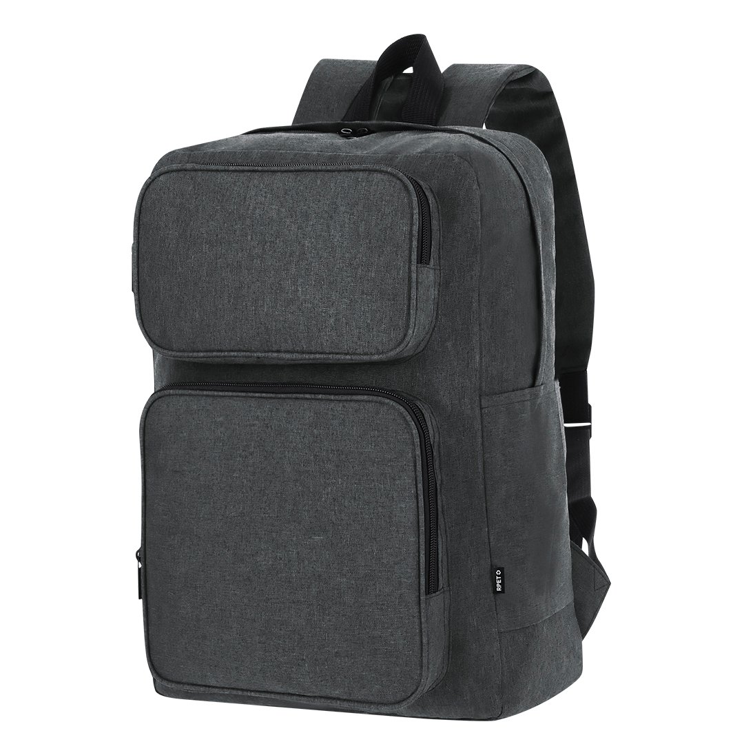 Mochila fabricada en suave poliéster RPET 600D. Con bolsillo principal de cierre de cremallera con doble tirador. Bolsillo interior para portátil de hasta 15 pulgadas y Tablet de hasta 10 pulgadas. Incluye dos bolsillos frontales con cierre de cremallera y bolsillos en los laterales. Espalda y cintas acolchadas ajustables. Incluye cinta de transporte para ajuste en trolley o maleta, ideal para viajes. Con distintivo de RPET en etiqueta.El material RPET se elabora a partir de plástico reciclado, para así fomentar la reutilización de residuos plásticos y ayudar a la sostenibilidad del planeta.