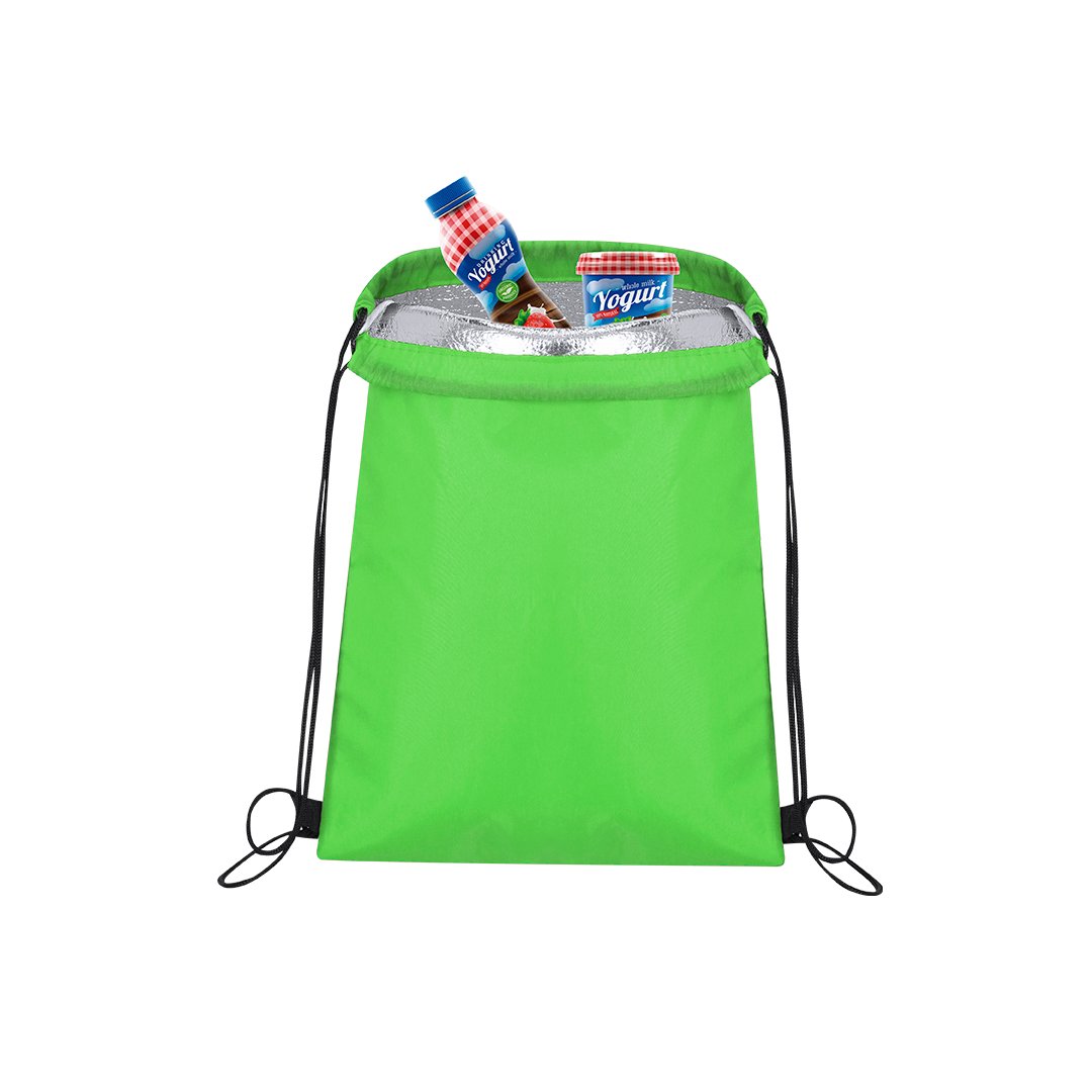 Mochila nevera de cuerdas para niño en suave poliéster 210D de alegres colores y extensa gama de colores. Con cuerdas autocierre en color negro y esquinas con refuerzo. Interior isotermo en acabado de aluminio.