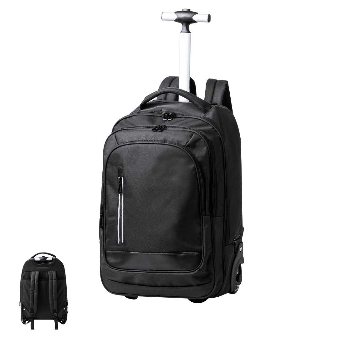 Mochila trolley de 2 ruedas en poliéster 300D de alta calidad. Incluye compartimento interior acolchado para ordenador portátil de hasta 15 pulgadas. Con asa exterior reforzada a juego y prácticos bolsillos en parte frontal. Con cremalleras a juego, además incluye cintas para hombro acolchadas y ocultas en parte posterior para usar como mochila. Presentado en bolsa individual reciclada.