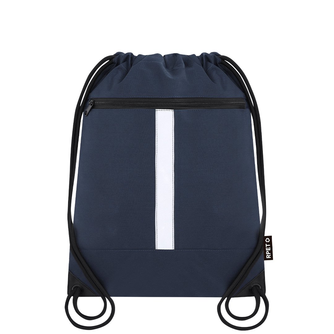 Mochila reflectante en Poliéster 300 RPET, con tira frontal reflectante. Cuenta con bolsillo en parte frontal. Cuerdas autocierre en color negro y esquinas reforzadas con argollas metálicas.