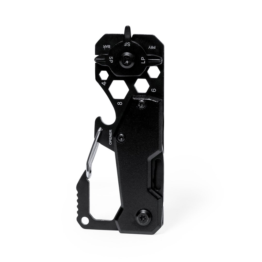 Excelente multiherramienta fabricada en aluminio y acero inox con acabado en color negro. Incluye 13 funciones diferentes: llave para tuercas hexagonales en varios tamaños, mosquetón, abrelatas, regla, rasqueta, cuchillo, destornilladores planos y philips. Presentada en caja de diseño kraft.