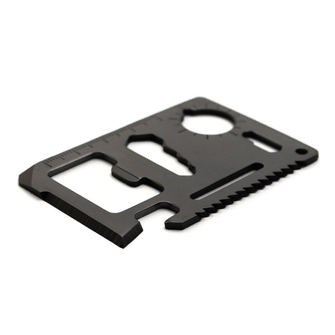 Multiherramienta con resistente cuerpo en acero inox con 11 funciones. Con funciones abrelatas, cuchillo, destornillador, regla, abrebotellas, llaves inglesas, llaves de mariposas, sierra e indicador de dirección. Presentada en resistente funda de polipiel.