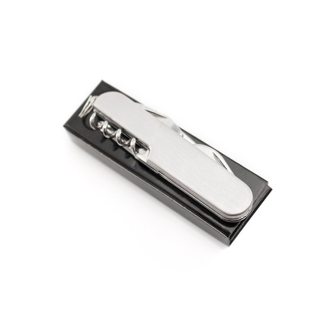 Navaja multiusos de acero inox de 6 funciones. Incluye navaja, abridores, destornillador y anilla para llavero. Presentada en caja individual.