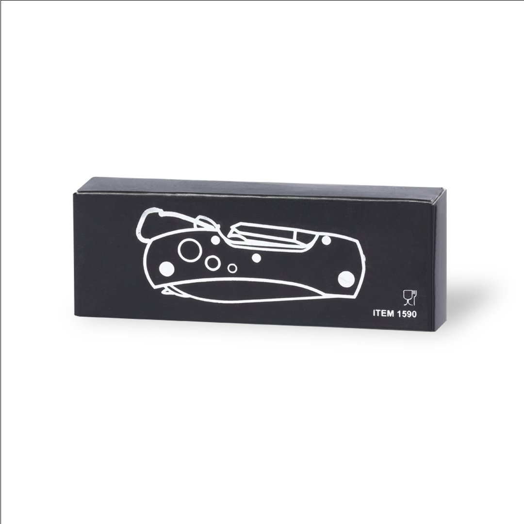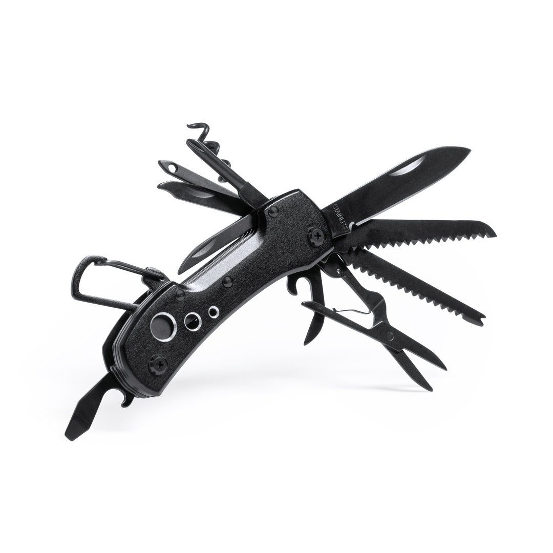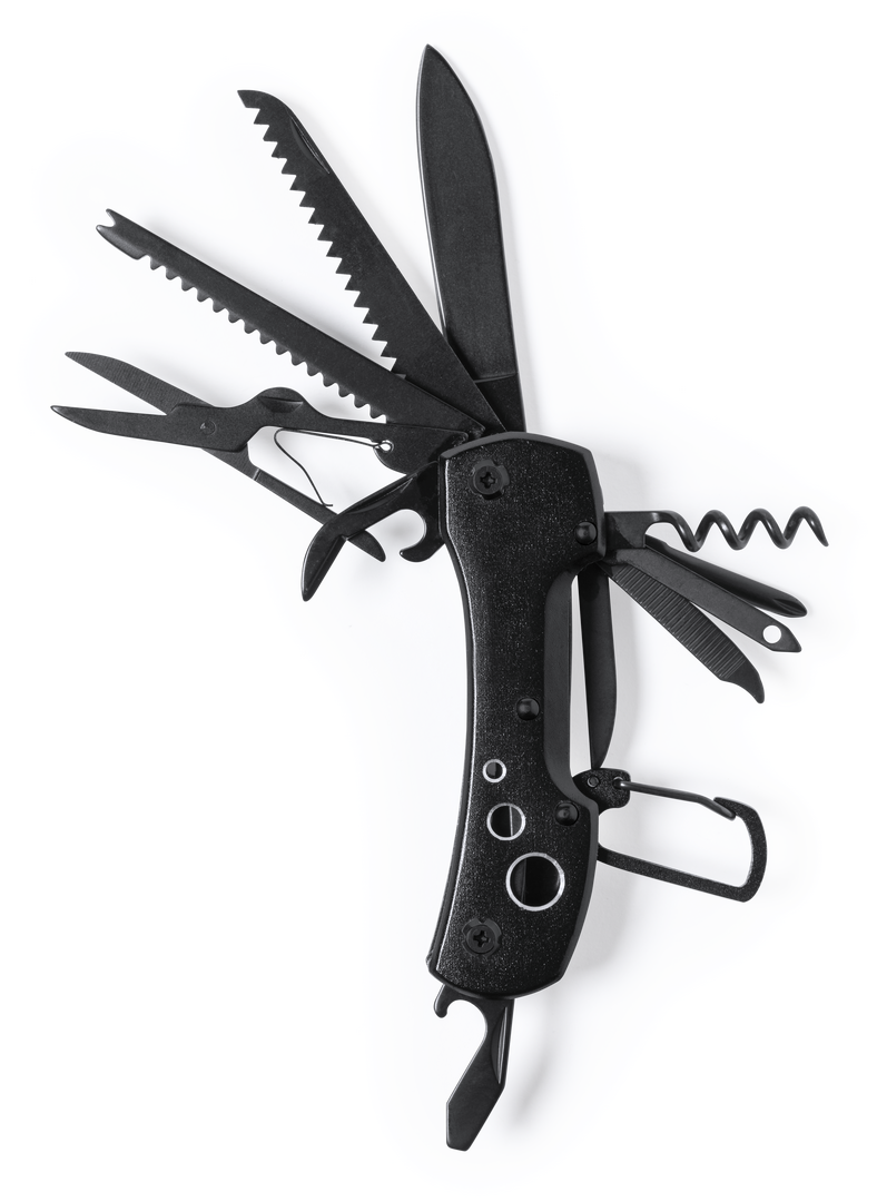 Navaja multiusos con accesorios en acero inox de acabado negro y resistente empuñadura a juego en aluminio, con mosquetón integrado en mango. 13 funciones, entre ellas cuchillo y navaja destornillador, lima abridor y tijeras. Plegable y de tamaño compacto, presentada en caja individual de diseño negra.