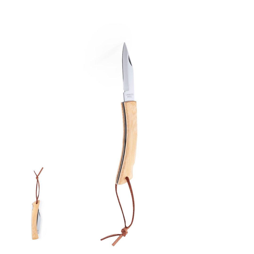 Navaja de línea nature con hoja de acero inox y resistente empuñadura de bambú con bloqueo de seguridad. Con cinta para transporte en polipiel y presentada en caja individual.