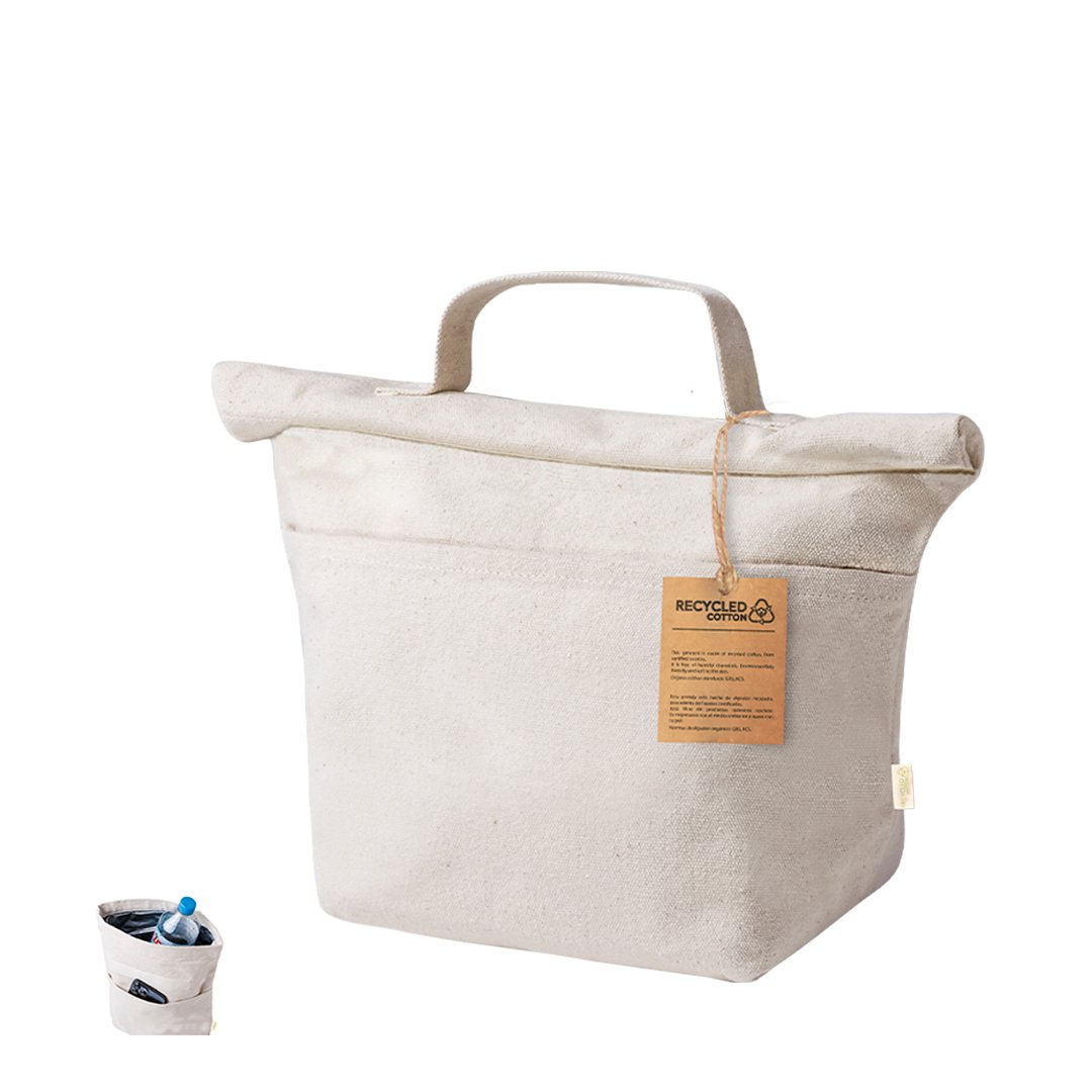 Bolsa térmica elaborada con material 100% algodón reciclado, cuenta con un interior isotérmico acabado en PEVA para mantener la temperatura. Se cierra con un práctico velcro y dispone de un bolsillo exterior. Su asa facilita el transporte. Etiqueta distintiva de algodón reciclado. Presentado en bolsa individual reciclada.