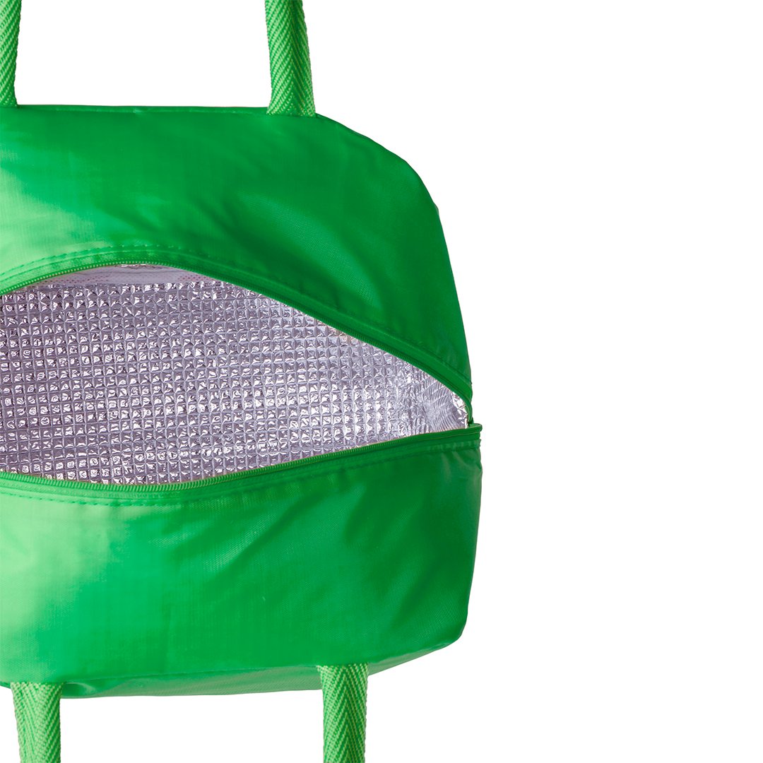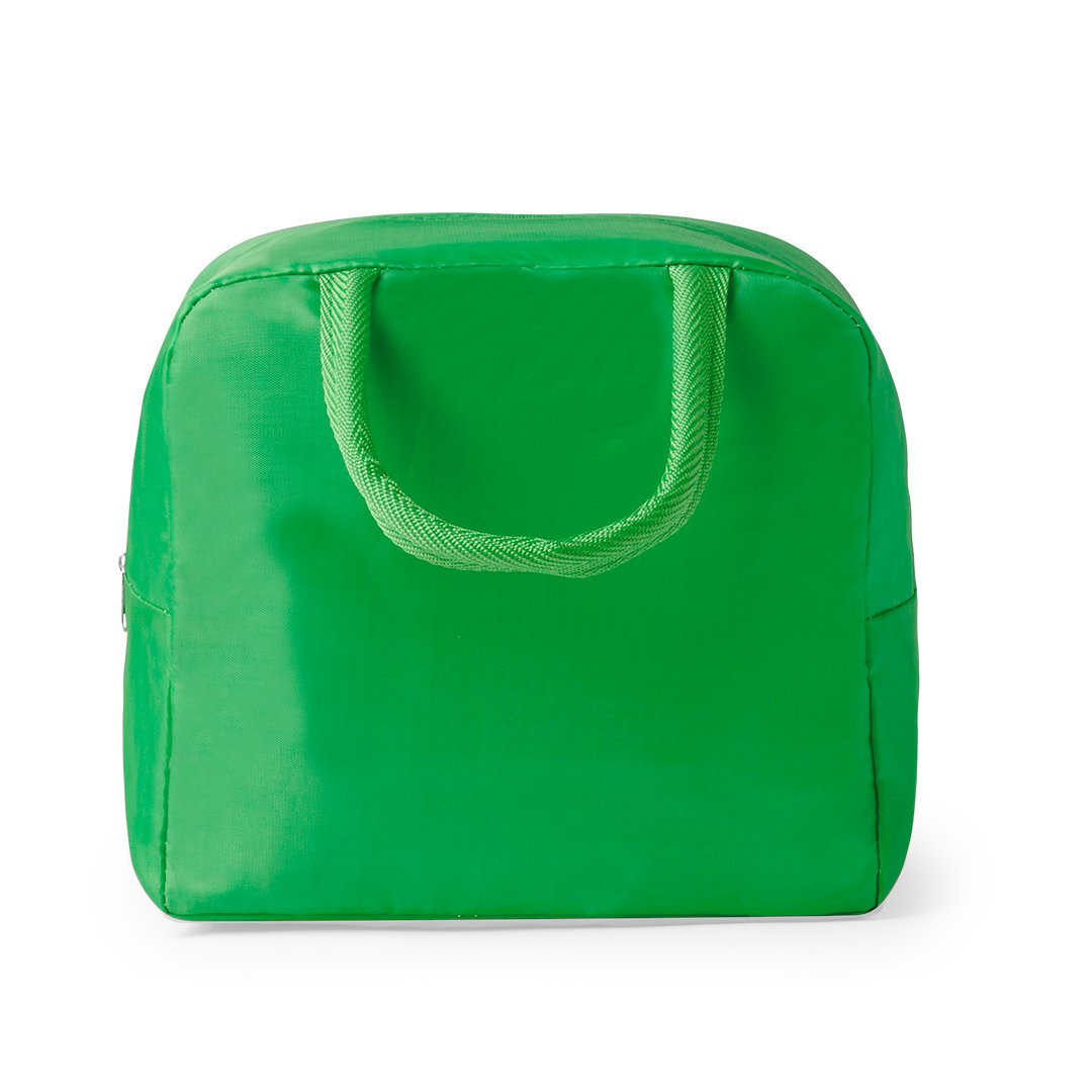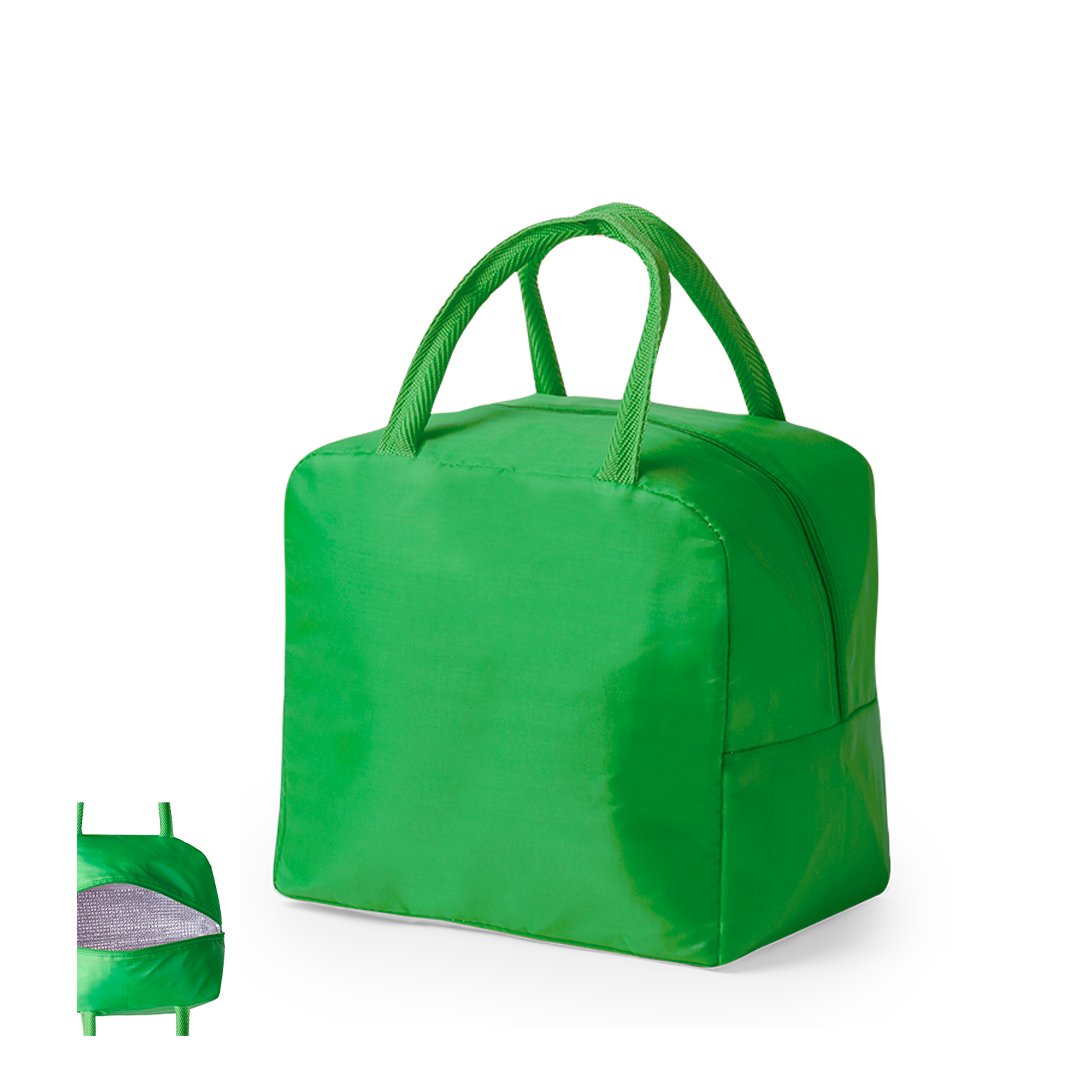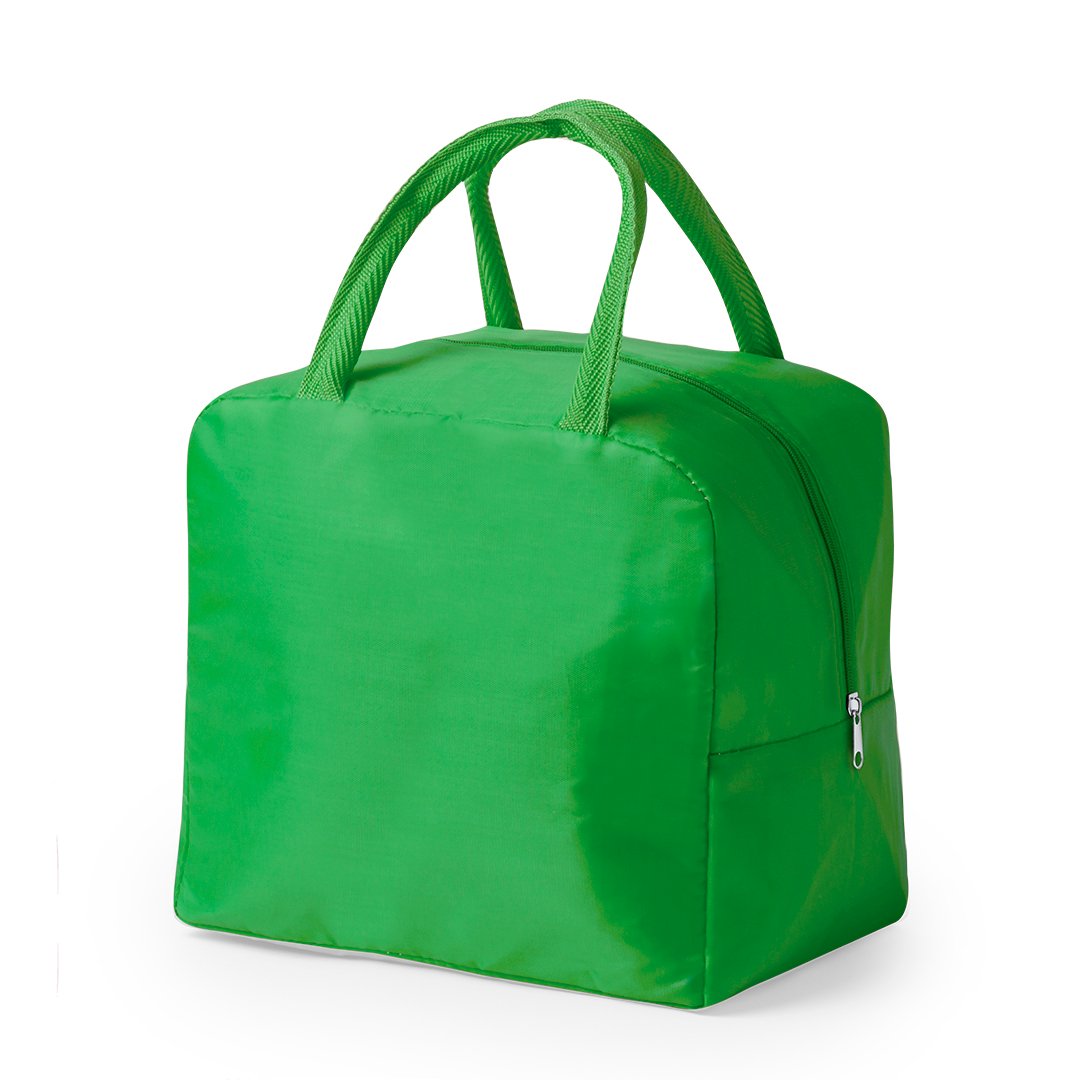 Nevera en resistente poliéster 210D. Compartimento principal con cierre de cremallera e interior en aluminio con base reforzada. Incluye asas a conjunto. Disponible en variada gama de colores. Presentada individualmente en bolsa reciclada.