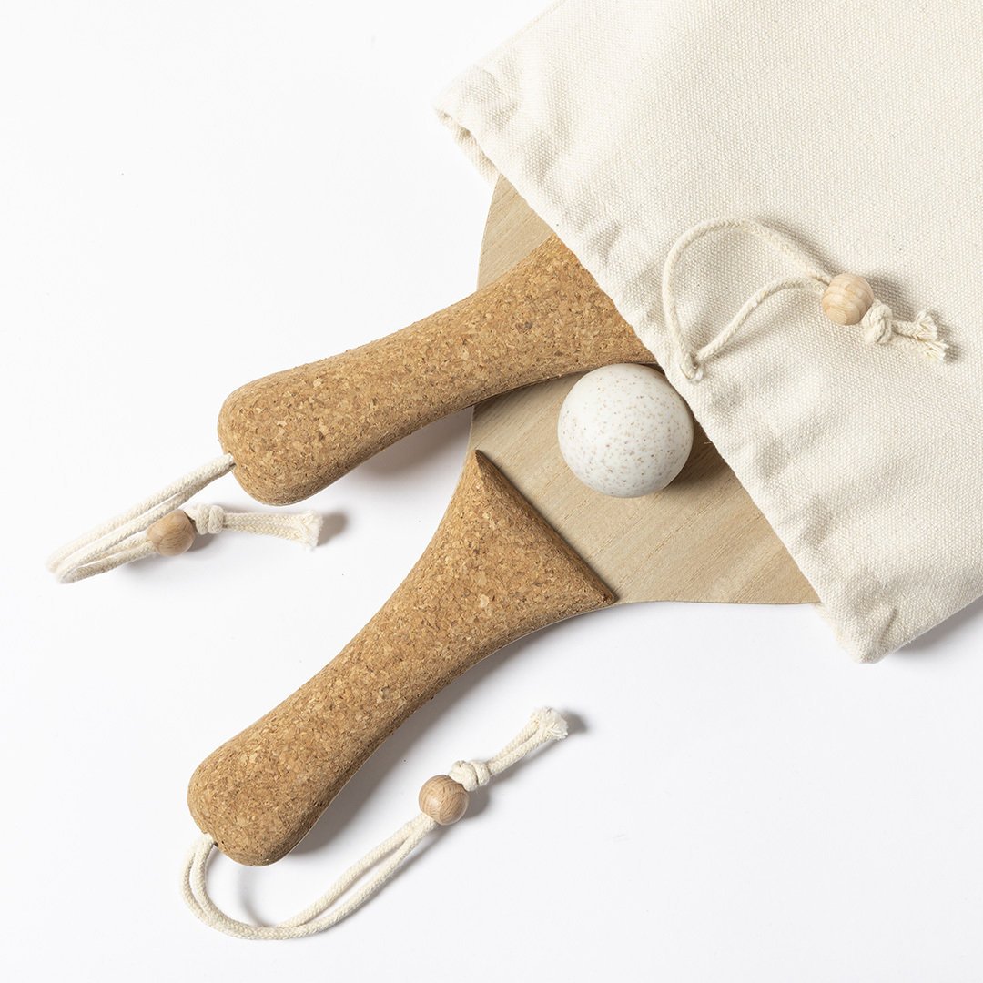 Par de palas de playa de línea nature. Fabricadas en madera, con mango reforzado en corcho natural y cintas para muñeca con ajustador. Presentadas en bolsa de algodón natural con cierre de cordón y pelota en caña de trigo.