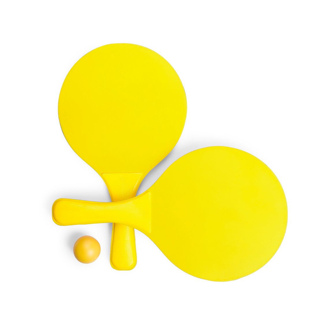 Par de palas de playa de alta calidad en madera natural de variada gama en vivos colores. Con mango reforzado a juego y presentadas en bolsa redecilla con pelota.