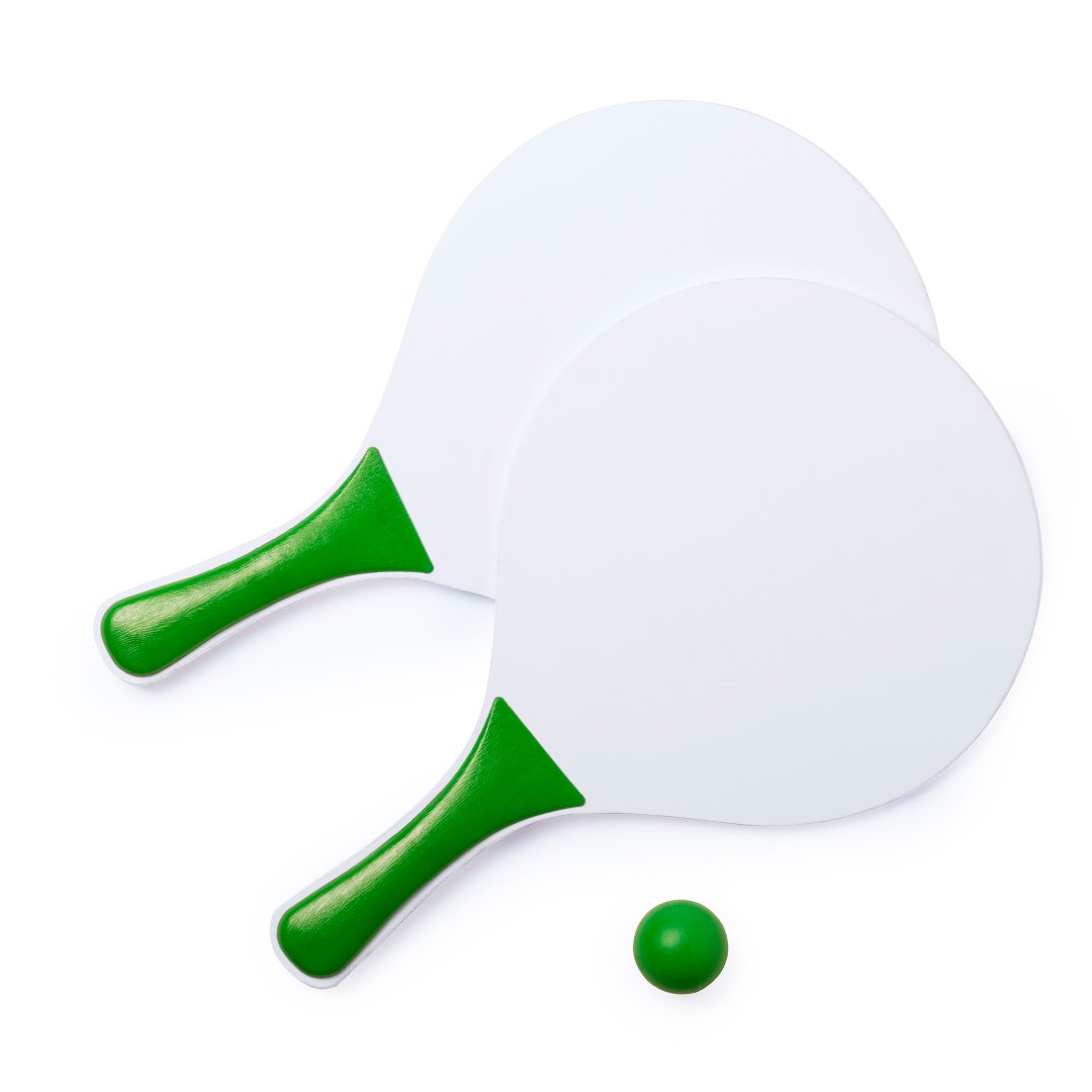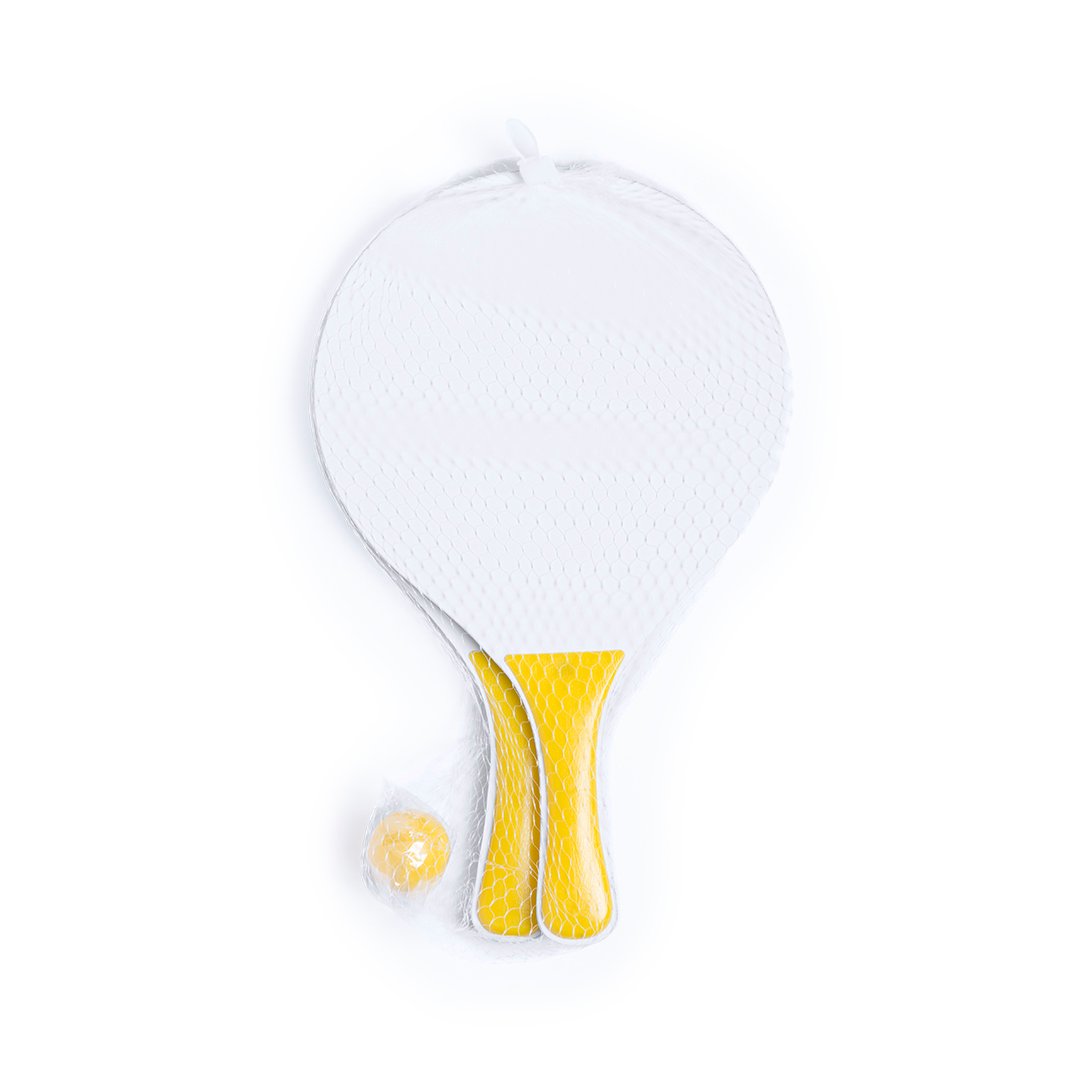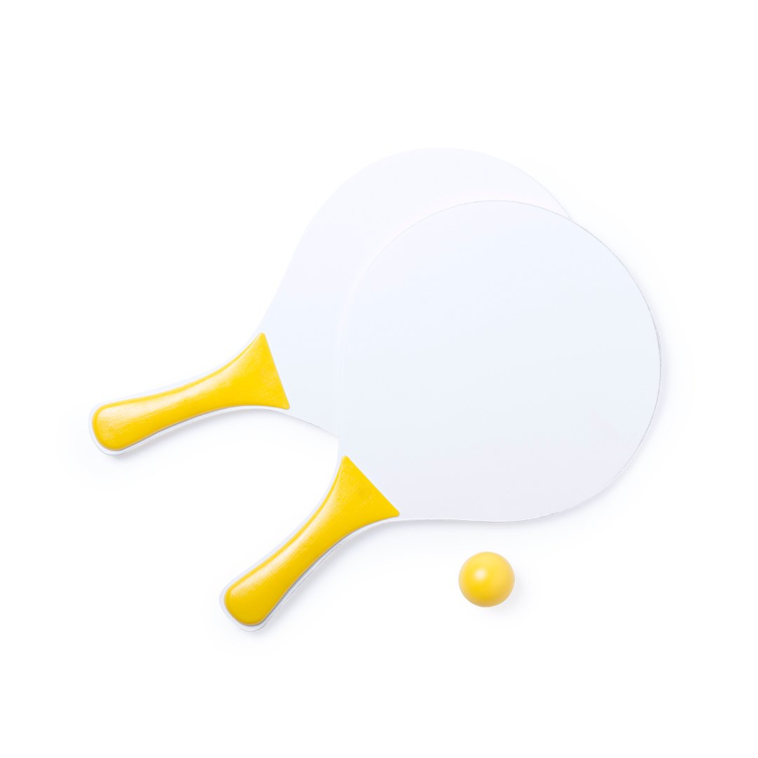 Par de palas de playa en madera natural blanca. Con mango reforzado en variada gama de vivos colores. Presentadas en bolsa redecilla con pelota a juego.