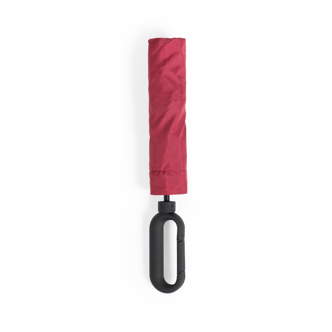 Paraguas plegable de 8 paneles en variada gama de colores. De 100cm de diámetro, apertura manual, con sistema antiviento y en resistente material pongee. Con varillas de fibra en color negro, cierre de velcro y mango ergonómico con mosquetón de enganche integrado. Presentado en funda individual a juego.