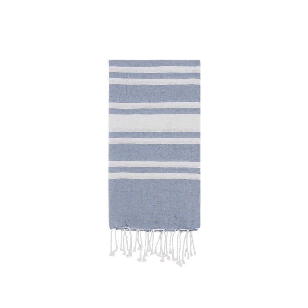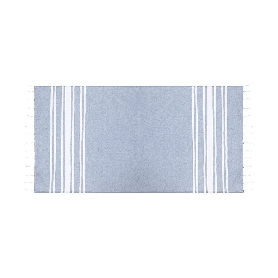 Suave pareo-toalla de 150g/m2 en combinación de algodón y poliéster. Su diseño cuenta con una base en color y rayas blancas, .Incluye flecos en los extremos que añaden un detalle decorativo y que completan su acabado.