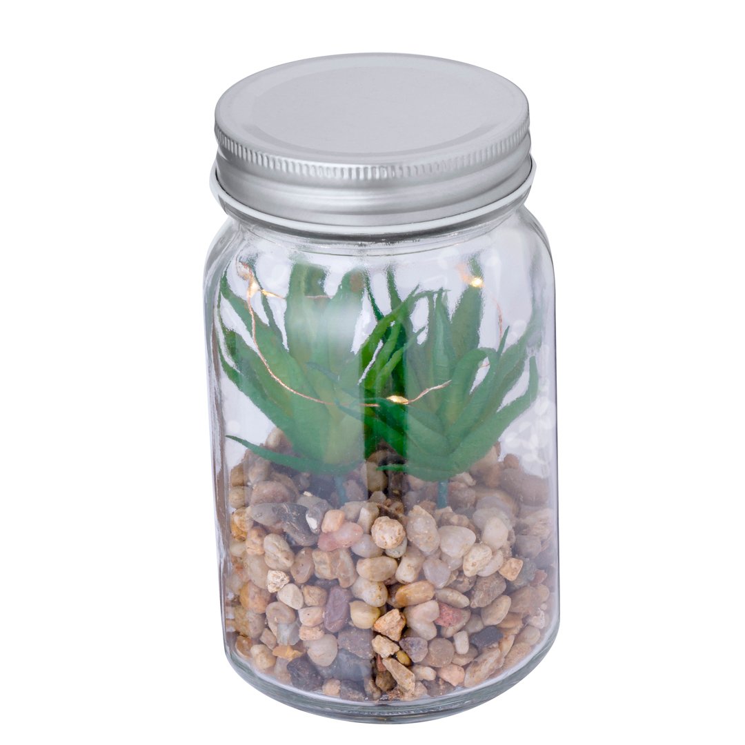 Planta decorativa sobre una base de piedras, en tarro de cristal de borosilicato. Iluminada por 5 LEDs que funcionan con 3 pilas AAA (no incluidas). Presentado en caja de diseño kraft.Fabricado en cristal de borosilicato, que ofrece una resistencia y durabilidad excepcionales, alargando su vida útil y pudiendo ser reutilizado infinidad de veces.