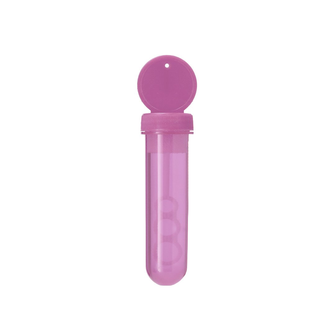 Pompero con aplicador especial que permite crear pompas en 3 tamaños. Líquido incluido (30 ml). Con tapadera de color sólido y cuerpo translúcido.