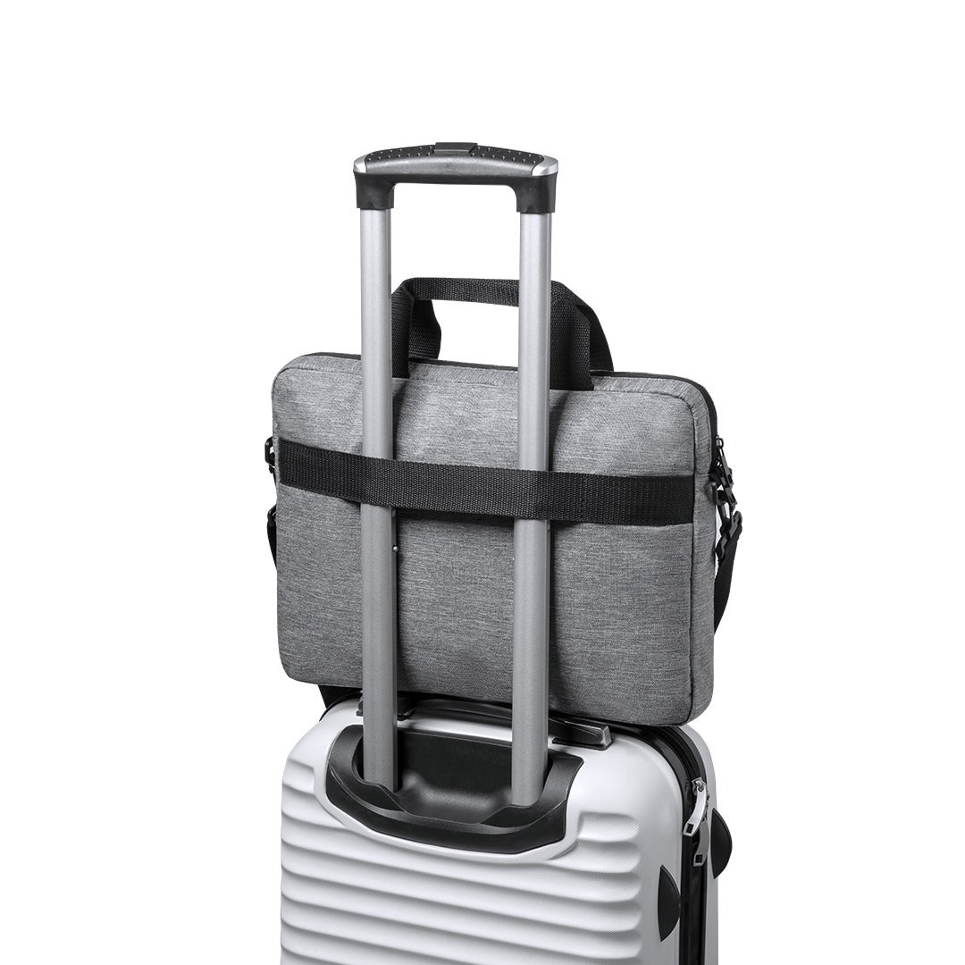 Elegante portadocumentos de línea nature en resistente 600D RPET efecto melange, elaborado a partir de plástico reciclado para así fomentar la reutilización de residuos plásticos y contribuir a la sostenibilidad del planeta. Detalles en negro, incluye compartimentos interiores acolchados para ordenador de hasta 15 pulgadas y tablet de hasta 10 pulgadas. Accesorio en parte posterior para anclaje al trolley, bolsillo exterior con cierre de cremallera, cómodas asas reforzadas, cinta bandolera ajustable con cierre de mosquetón y almohadilla para hombro a juego. Distintivo RPET en etiqueta exterior.