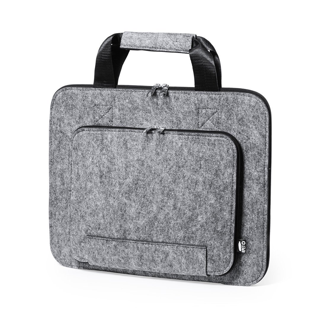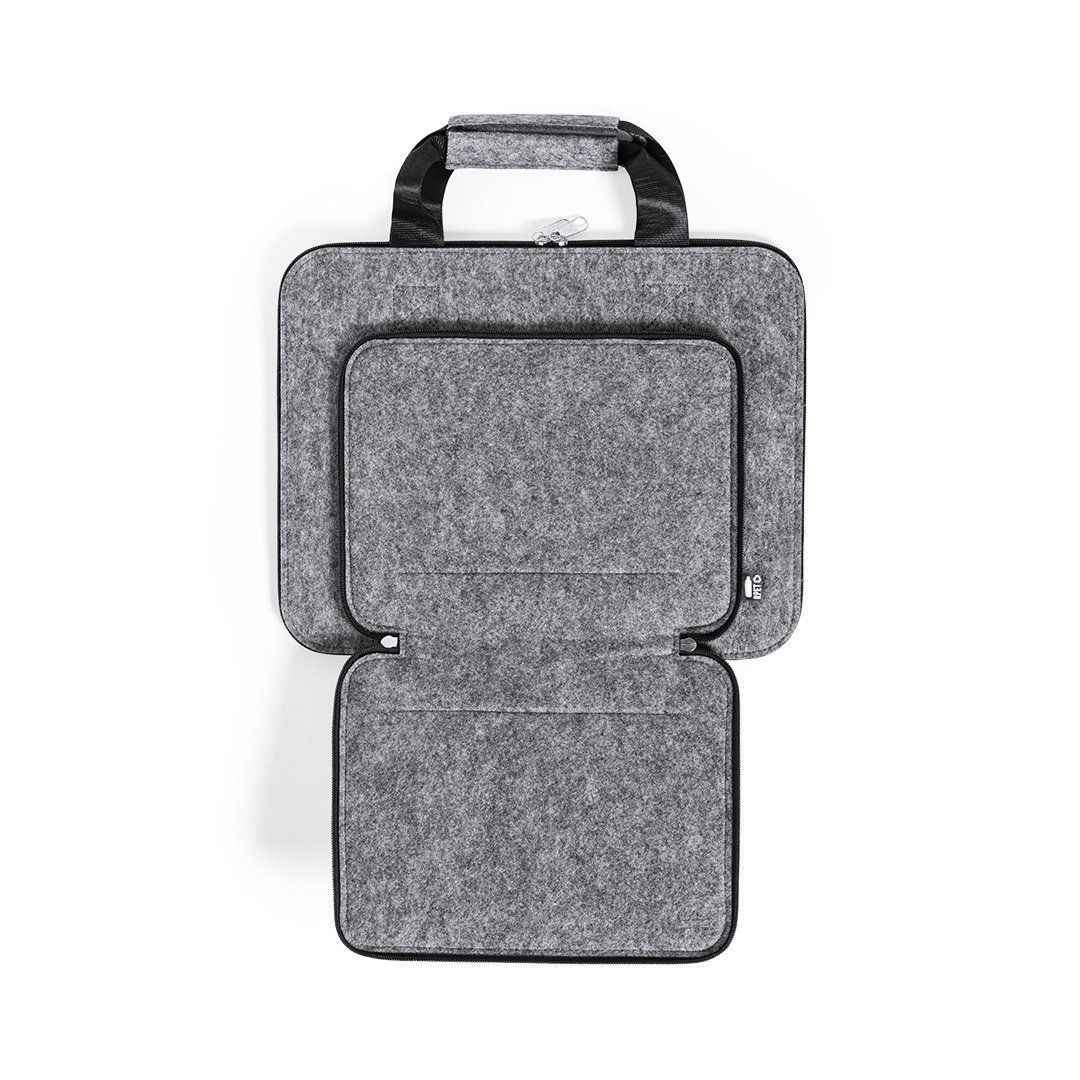 Portadocumentos de línea nature y en resistente fieltro RPET reciclado, fruto de la combinación del proceso de reciclaje de materiales plásticos junto con la técnica milenaria de fabricación del fieltro, dando como resultado un material de eco-tendencia que, además de ser de origen reciclado, también se convierte en reciclable. Bolsillos principal y frontal con cierres de cremallera y tiradores metálicos, con asas reforzadas a juego y distintivo RPET en etiqueta exterior.
