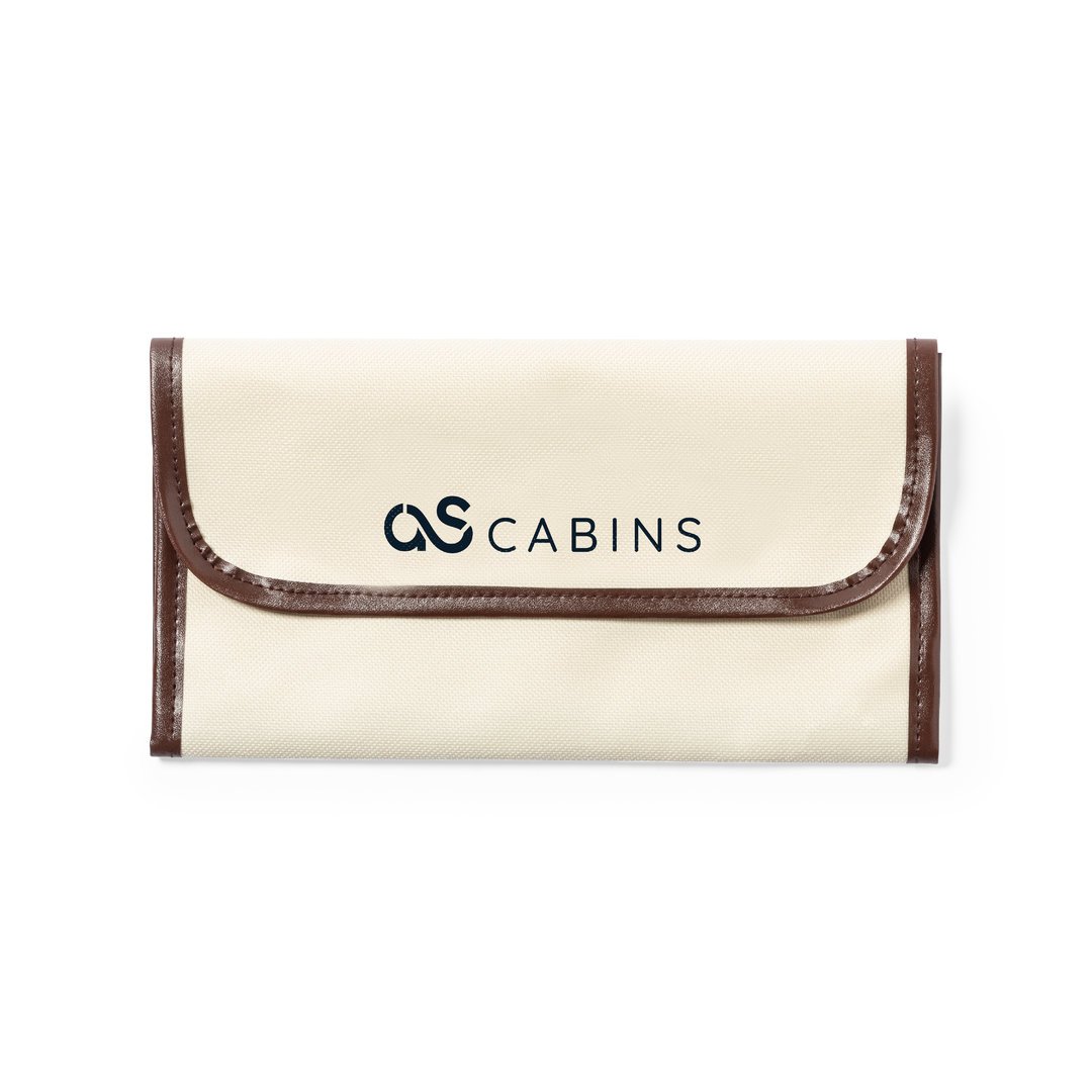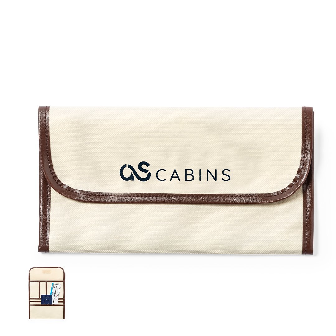 Portadocumentos de viaje fabricado en resistente 600D de acabado natural, con ribetes y refuerzos en polipiel marrón. Solapa con cierre de velcro y multitud de compartimentos interiores.