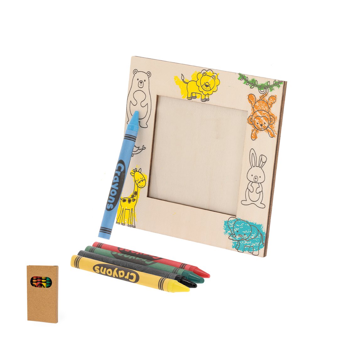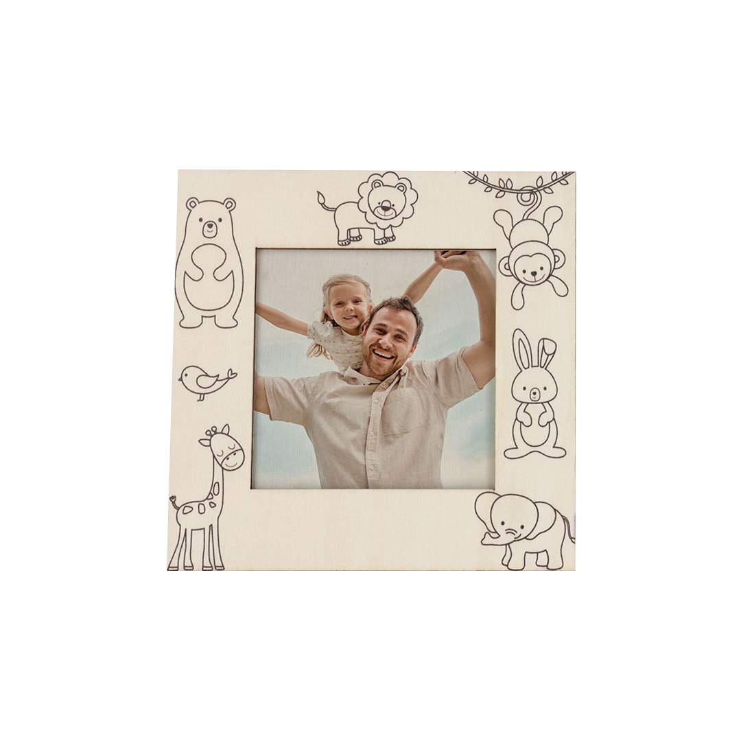 Marco de fotos fabricado en madera natural con diseño de animales. Incluye ceras de colores para personalizar y decorar el marco. Diseñado para fotografías de 7,5×7,5 cm. Cuenta con práctico soporte trasero de bisagra.
