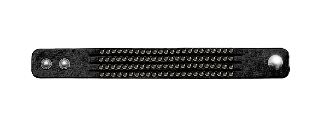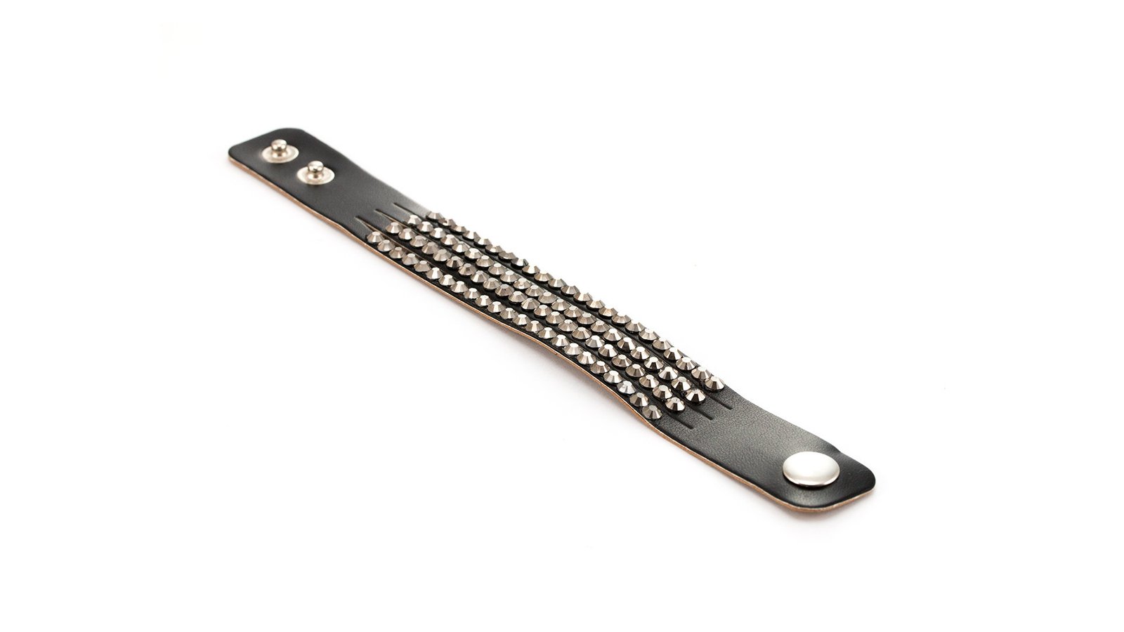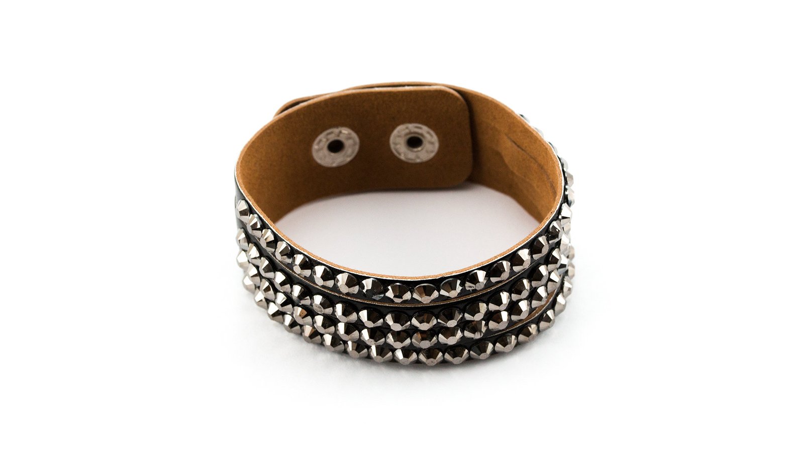 Elegante pulsera de polipiel con incrustaciones brillantea de vivos colores. Con cierre de corchete ajustable.